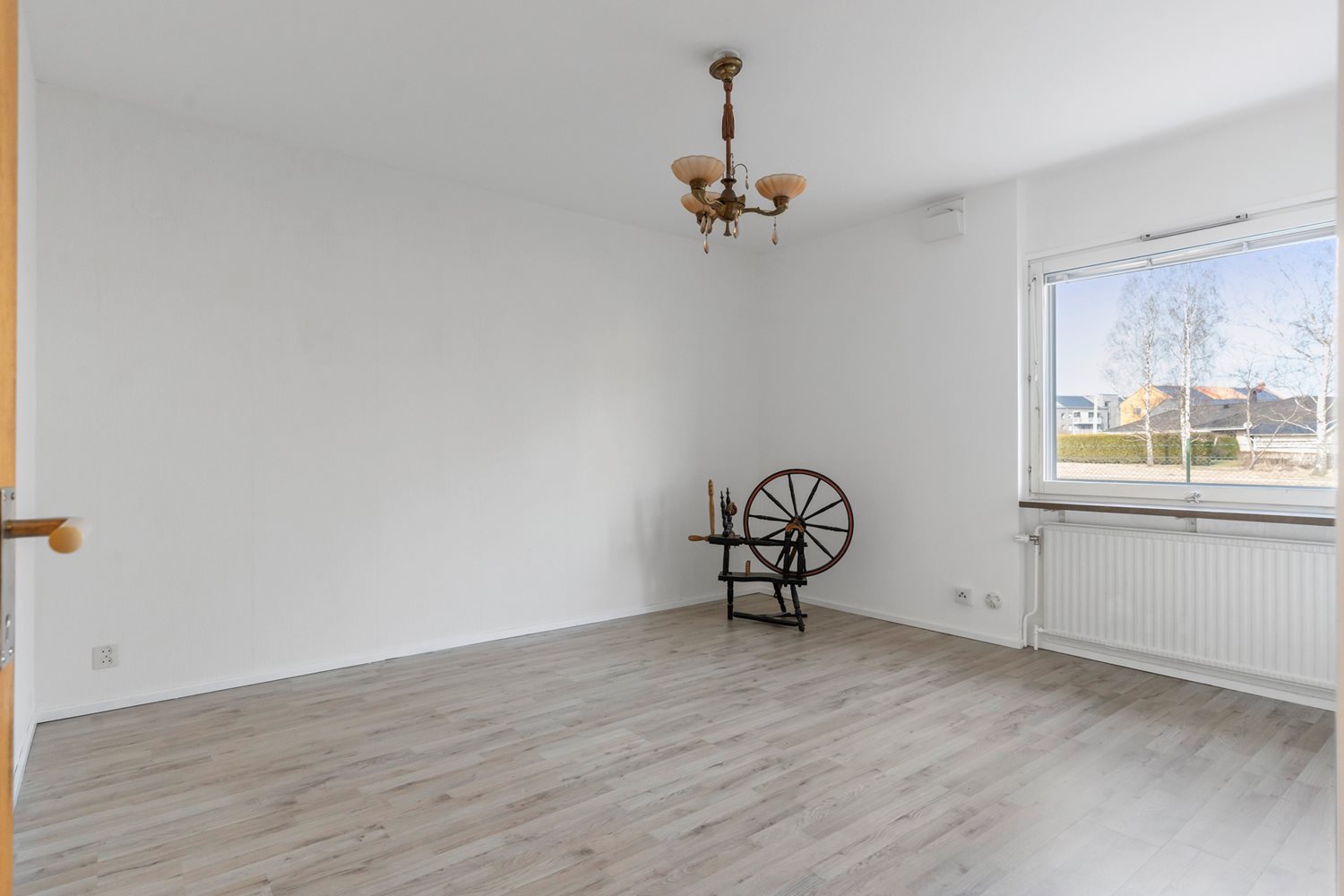 Ljust och rymligt vardagsrum med originalparkett (sliten) och målade väggar.