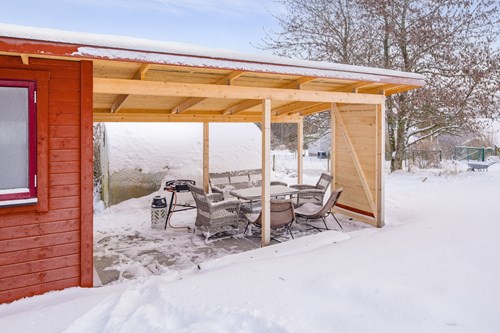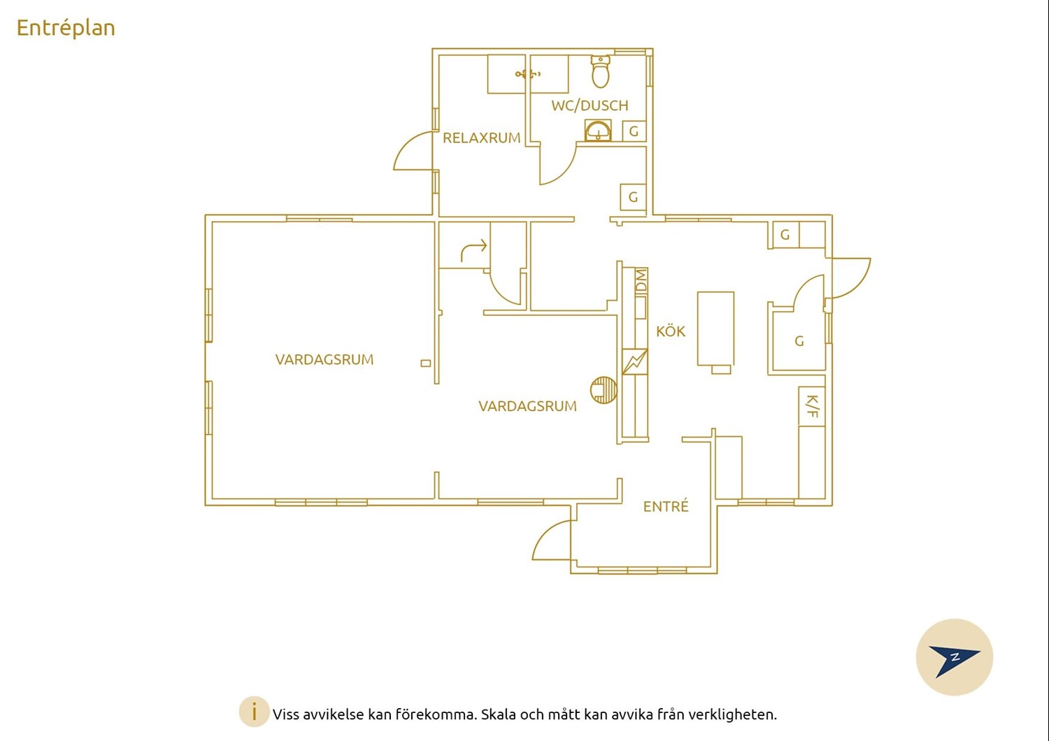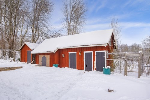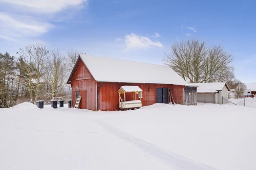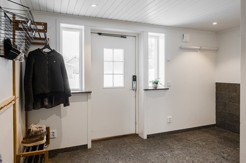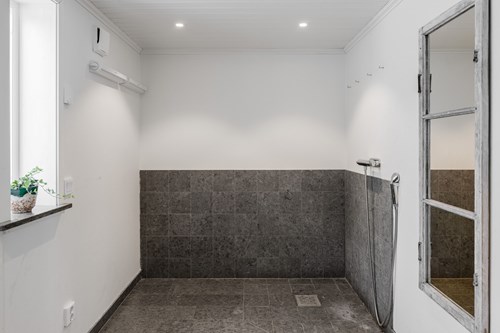 Stor och rymlig groventré med generösa avhängningsmöjligheter. Golvet pryds av vacker Kinnekullekalksten med behaglig golvvärme. Direkt innanför dörren finns en praktisk dusch, idealisk för att spola av smutsiga lekande barn eller hunden efter utevistelse. Från groventrén nås även ett badrum. Groventrén är belägen i en utbyggd del av huset som uppfördes 2018 och erbjuder en genomtänkt och funktionell entré för vardagens alla behov.