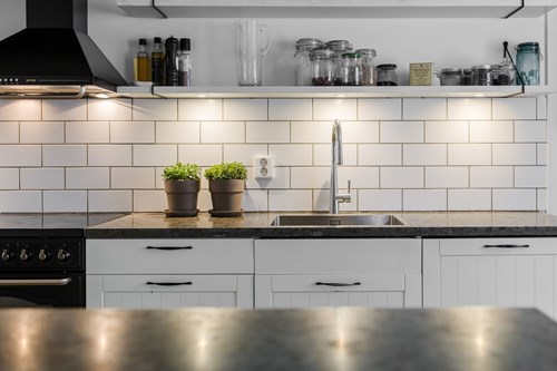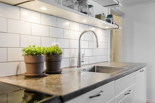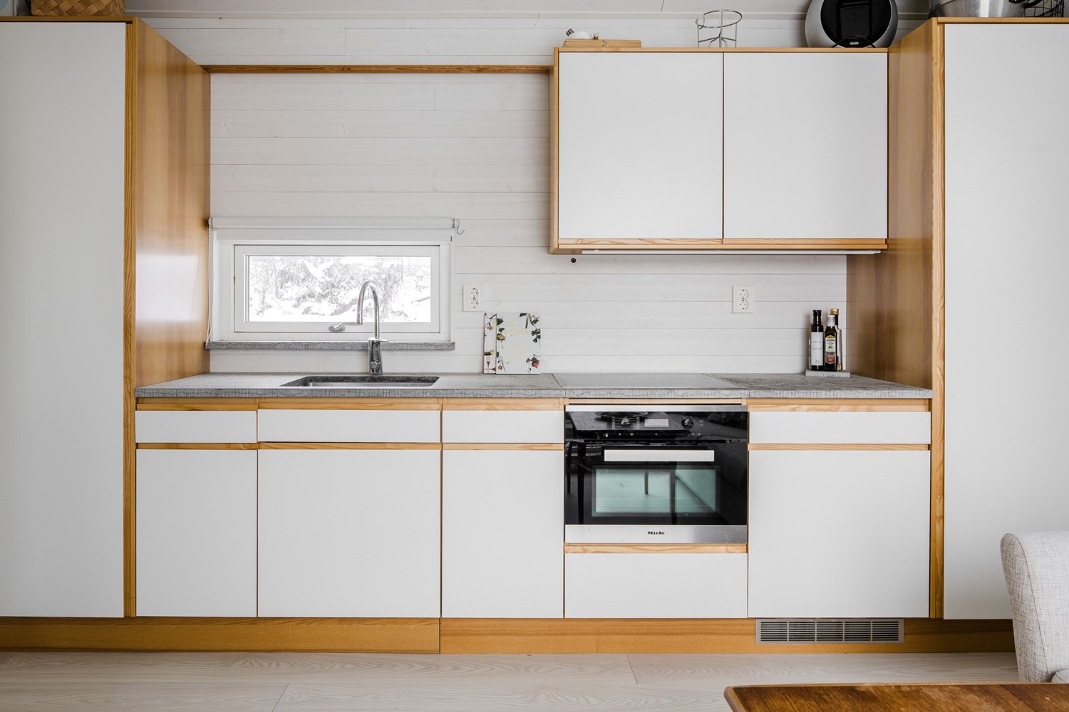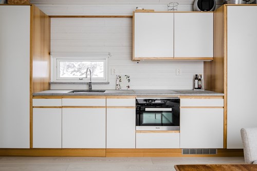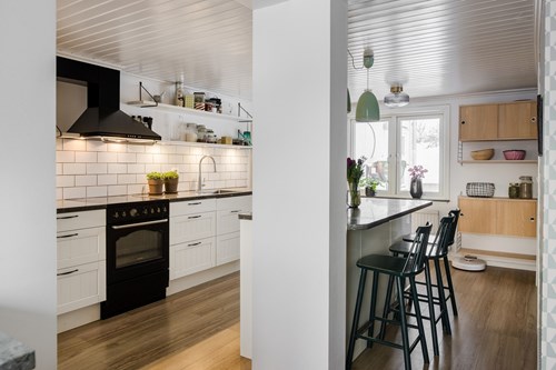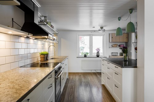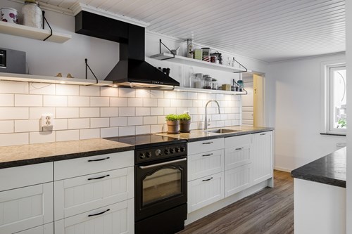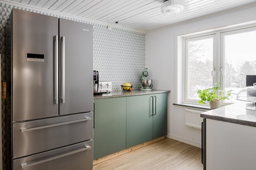 Modernt och stilrent kök från Epoq, nyrenoverat 2015, som nås både från groventrén och från husets finentré – vilket skapar ett smidigt flöde i vardagen. För extra bekvämlighet finns även en egen köksentré, praktiskt placerad med direkt kontakt mot attefallshuset och hönshuset. Köket har en trevlig köksö som fungerar både som arbetsyta och samlingsplats. Fina bänkskivor i Kinnekullekalksten, gott om förvaring och generösa arbetsytor gör köket både praktiskt och estetiskt tilltalande. Här finns ett rymligt skafferi man kan gå in i, en extra frys samt all modern utrustning man kan behöva för matlagning och bakning.