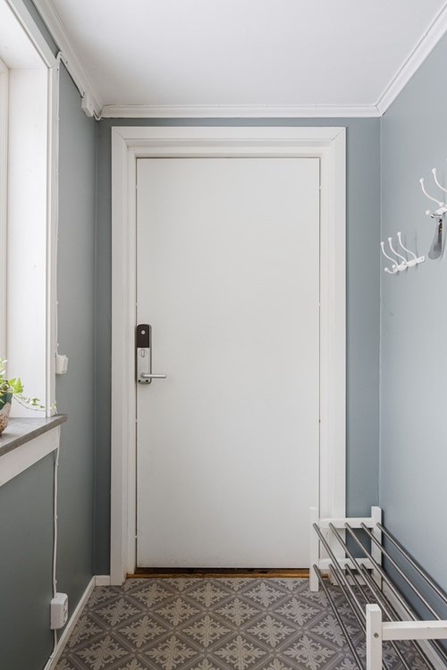 Välkomnande finentré som leder vidare in i husets sociala delar. Här möts man av ljus och rymd med en naturlig koppling till både kök och vardagsrum.