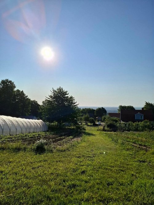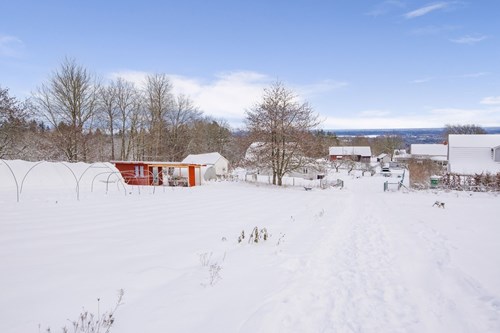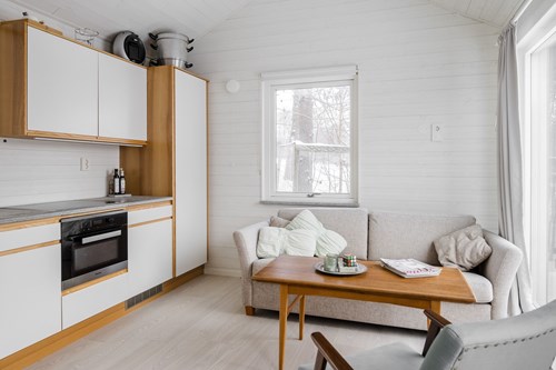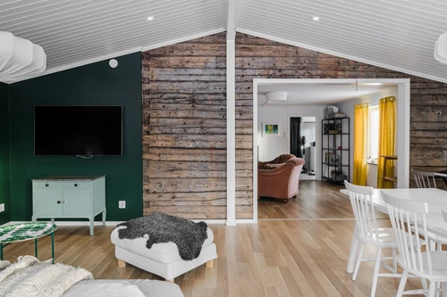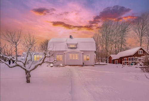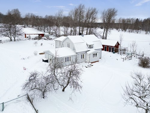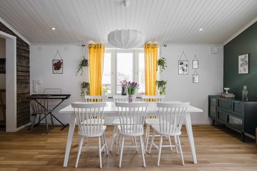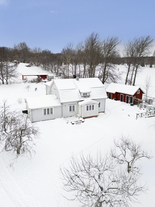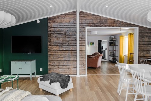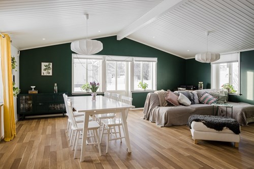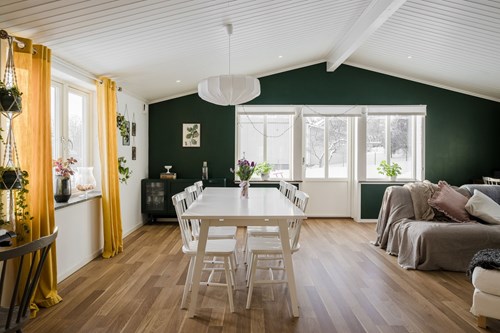 Mycket stort och inbjudande vardagsrum som byggts ut för att skapa generösa sällskapsytor. I den äldre delen finns en mysig eldstad som bidrar till värme och stämning. Den nyare delen har ryggåstak och stora fönsterpartier som släpper in rikligt med ljus och bjuder på vacker utsikt över de natursköna omgivningarna. Här finns även utgång till trädgården.