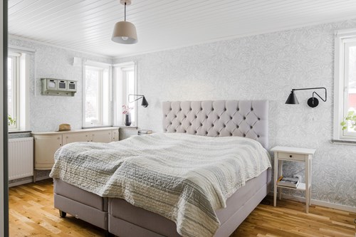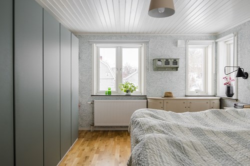 Rymligt och rofyllt sovrum med gott om plats för en dubbelsäng samt tillhörande möblemang. Rummet präglas av ett fint ljusinsläpp från flera fönster som skapar en ljus och trivsam atmosfär. Här finns flera garderober som erbjuder generösa och välorganiserade förvaringsmöjligheter, vilket bidrar till ett stilrent och harmoniskt intryck.