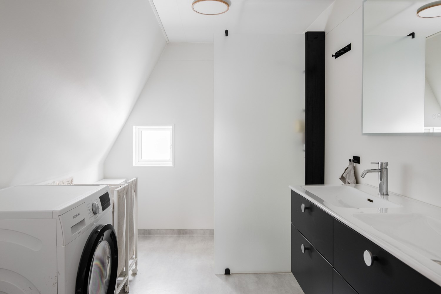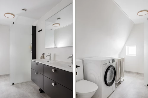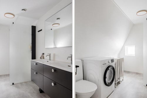 Nyrenoverat och stilrent badrum med moderna och genomtänkta materialval. Ljusa våtrumstapeter i kombination med våtrumsmatta i moderna färgtoner skapar en fräsch och harmonisk helhet. Här finns tvättmaskin som underlättar vardagen samt ett litet fönster som ger ett fint och naturligt ljusinsläpp. Ett praktiskt och tilltalande badrum för hela familjen.