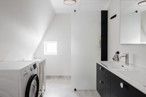 Ljust och stilrent badrum som nås från hallen, beläget i den utbyggda delen av huset som färdigställdes 2018. Två fönster ger ett generöst ljusinsläpp och skapar en härlig och luftig känsla. Golvet är klätt i vacker Kinnekullekalksten med behaglig golvvärme. Badrummet är utrustat med WC, dusch med glasdörrar samt en elegant handfatskommod i matchande Kinnekullekalksten. Förvaring finns i badrumsskåp som bidrar till en praktisk och välordnad helhet.