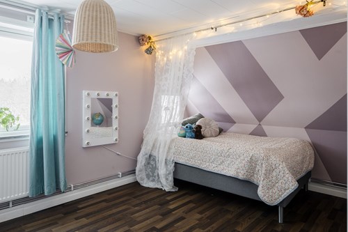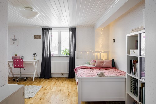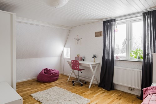 Stort och inbjudande barnrum med charmigt snedtak som skapar en ombonad känsla. Rummet har generösa ytor med gott om plats för säng, skrivbord och lek, vilket gör det lätt att anpassa efter barnets behov.