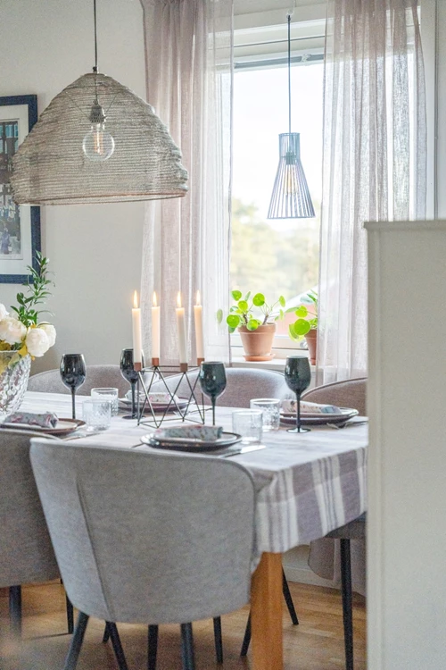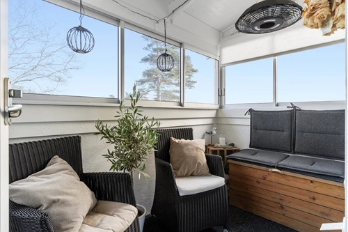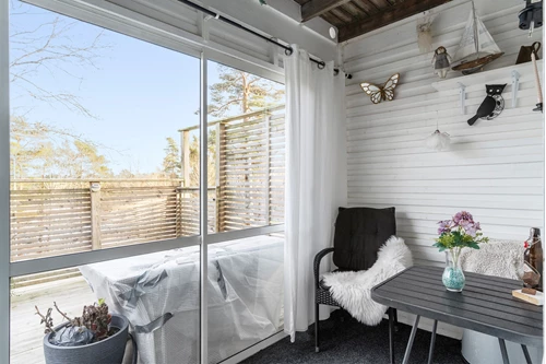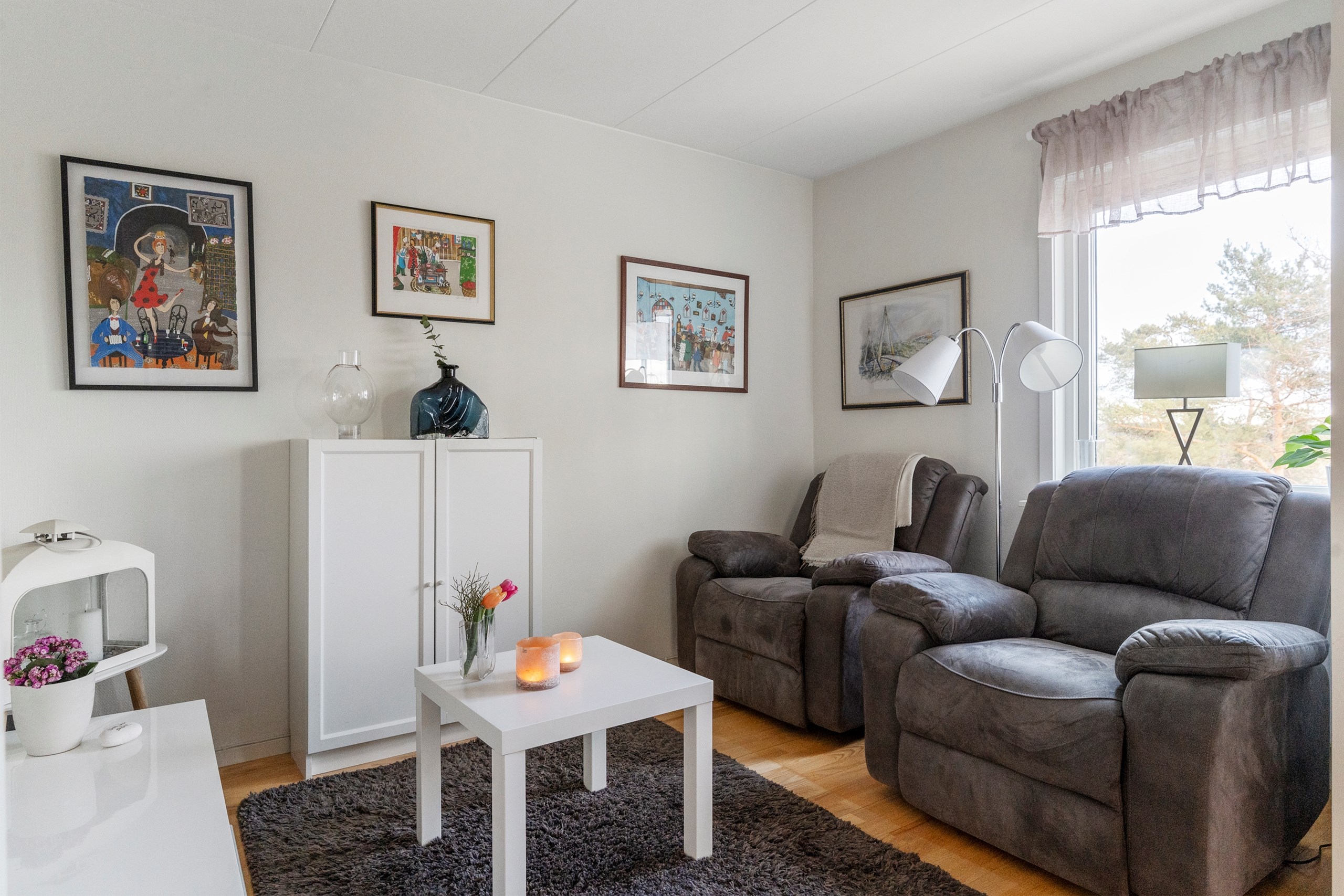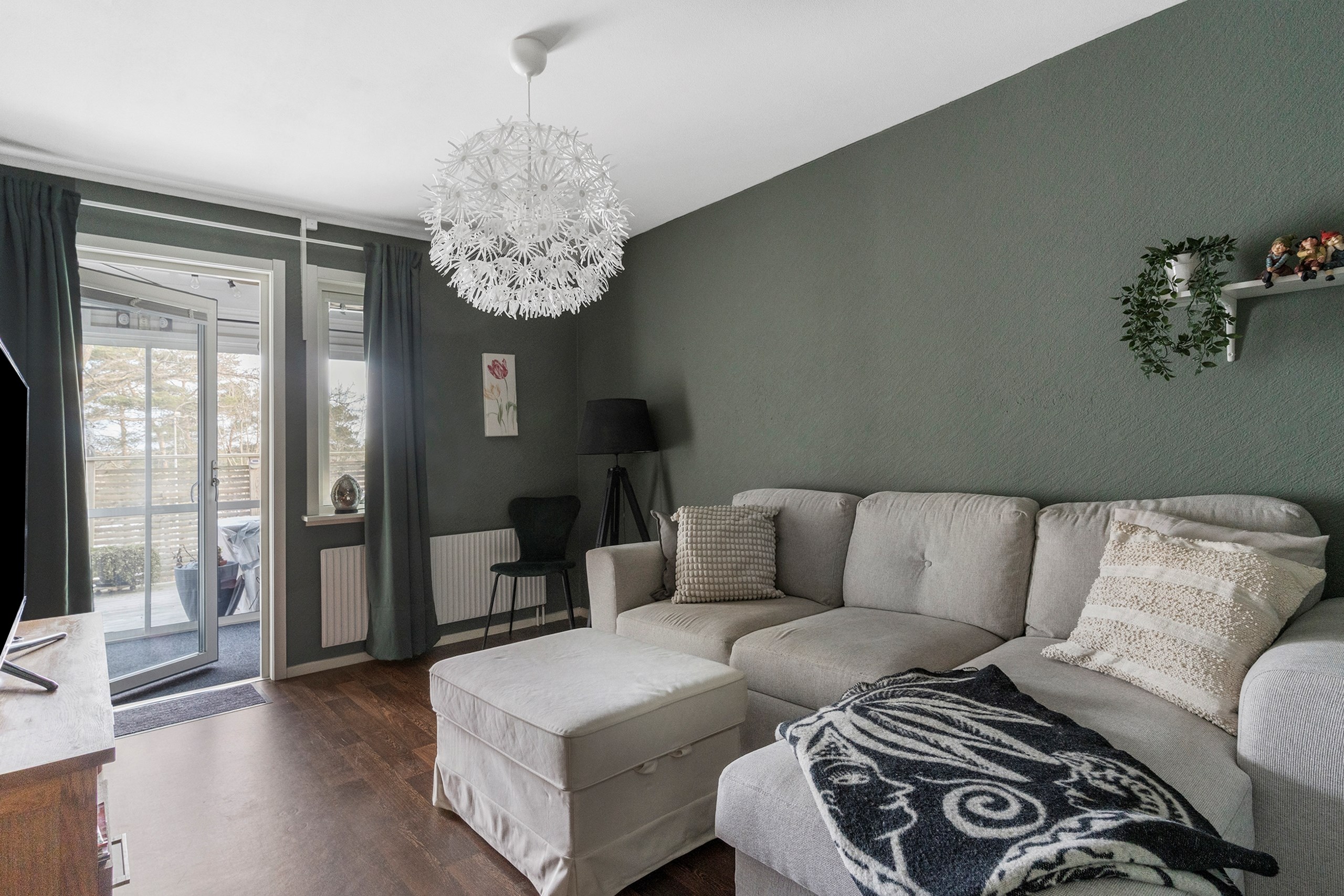 Ljust och rymligt vardagsrum med fönster åt två väderstreck tack vare gavelläget. Parkettgolv och målade väggar samt utgång till den inglasade balkongen.