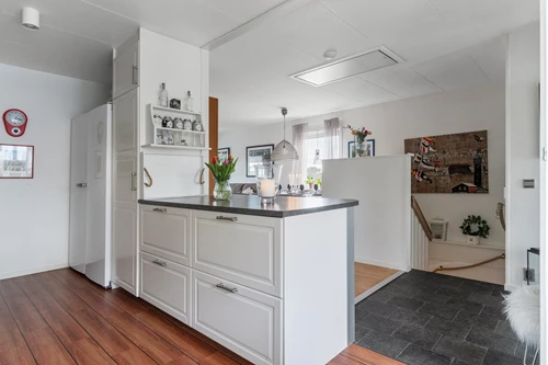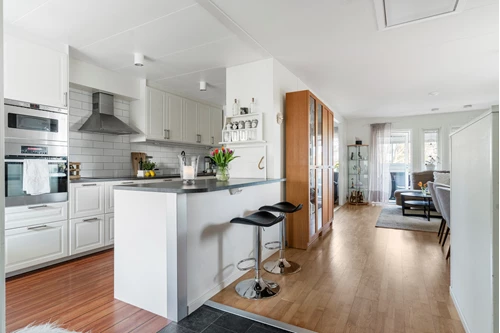 Trevligt kök med en delvis öppen planlösning med en härlig köksö ut mot vardagsrummet. Köket renoverades 2014 med vita köksluckor som erbjuder gott om förvaringsutrymmen, stora bänkytor samt en ljus och bra matplats. Inbyggd ugn (-14), inbyggd mikro (-14), häll (-16), fläkt (-14) samt kyl och frys (-14). Skeppsgolv (laminatgolv) och målade väggar. Ett härligt kök att umgås och laga mat i!