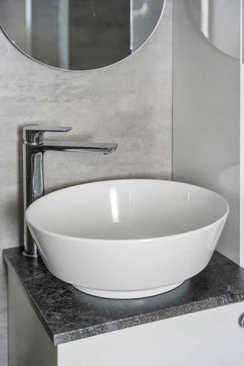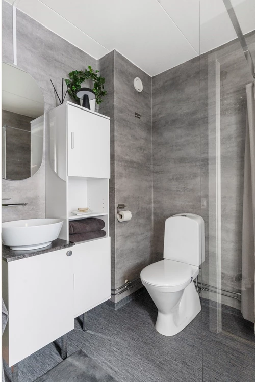 Fräscht badrum som renoverades 2025 med våtrumsmatta på golv och väggar. Wc, handfat, spegel, badrumsskåp och duschvägg.