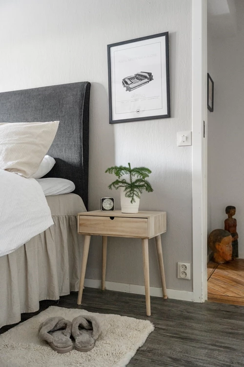 Rymligt sovrum med plastmatta och målade väggar. Här finns gott om utrymme för extra förvaringsmöbler.