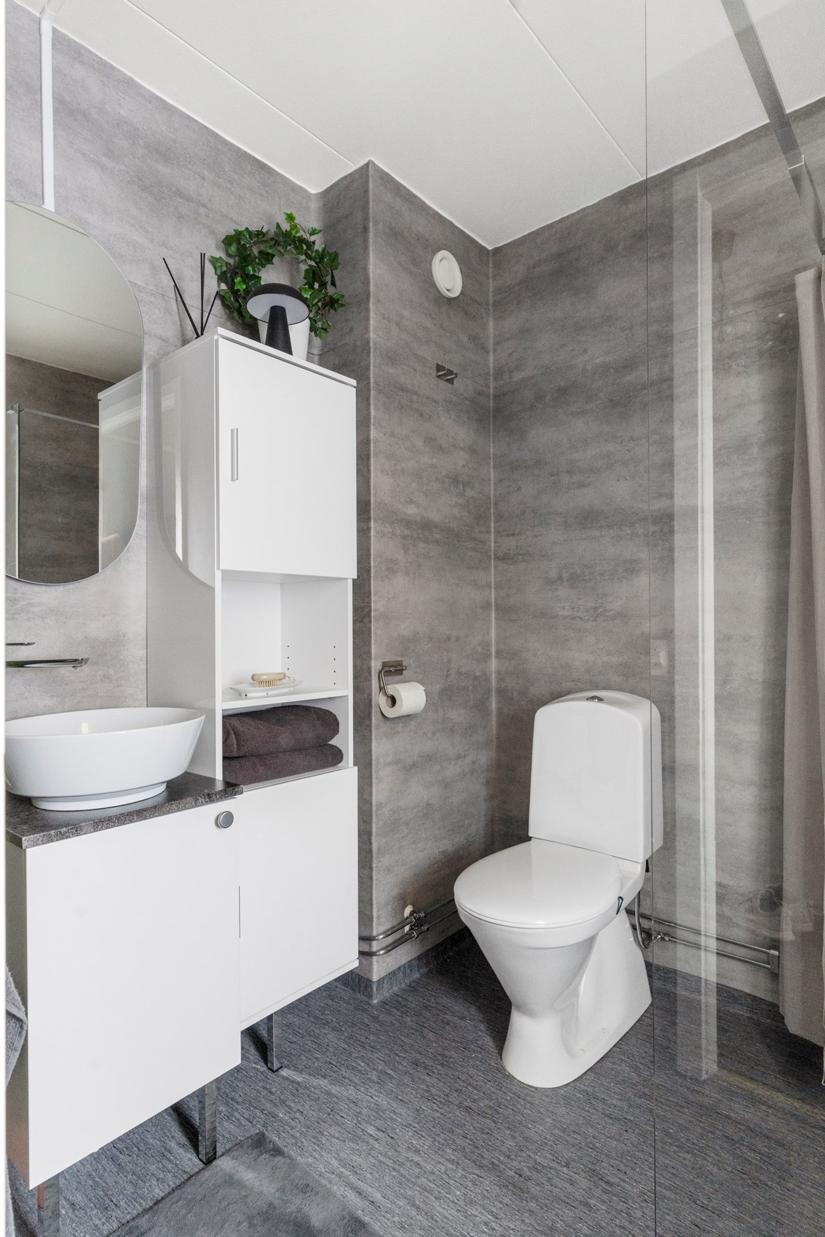 Fräscht badrum som renoverades 2018 med våtrumsmatta på golv och väggar. Wc, handfat, dusch och badrumsskåp. Här finns även plats för den som vill ha badkar istället för dusch.