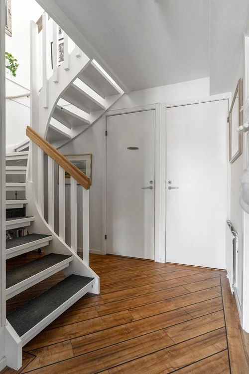 Hall med fint skeppsgolv (laminat) och målade väggar.