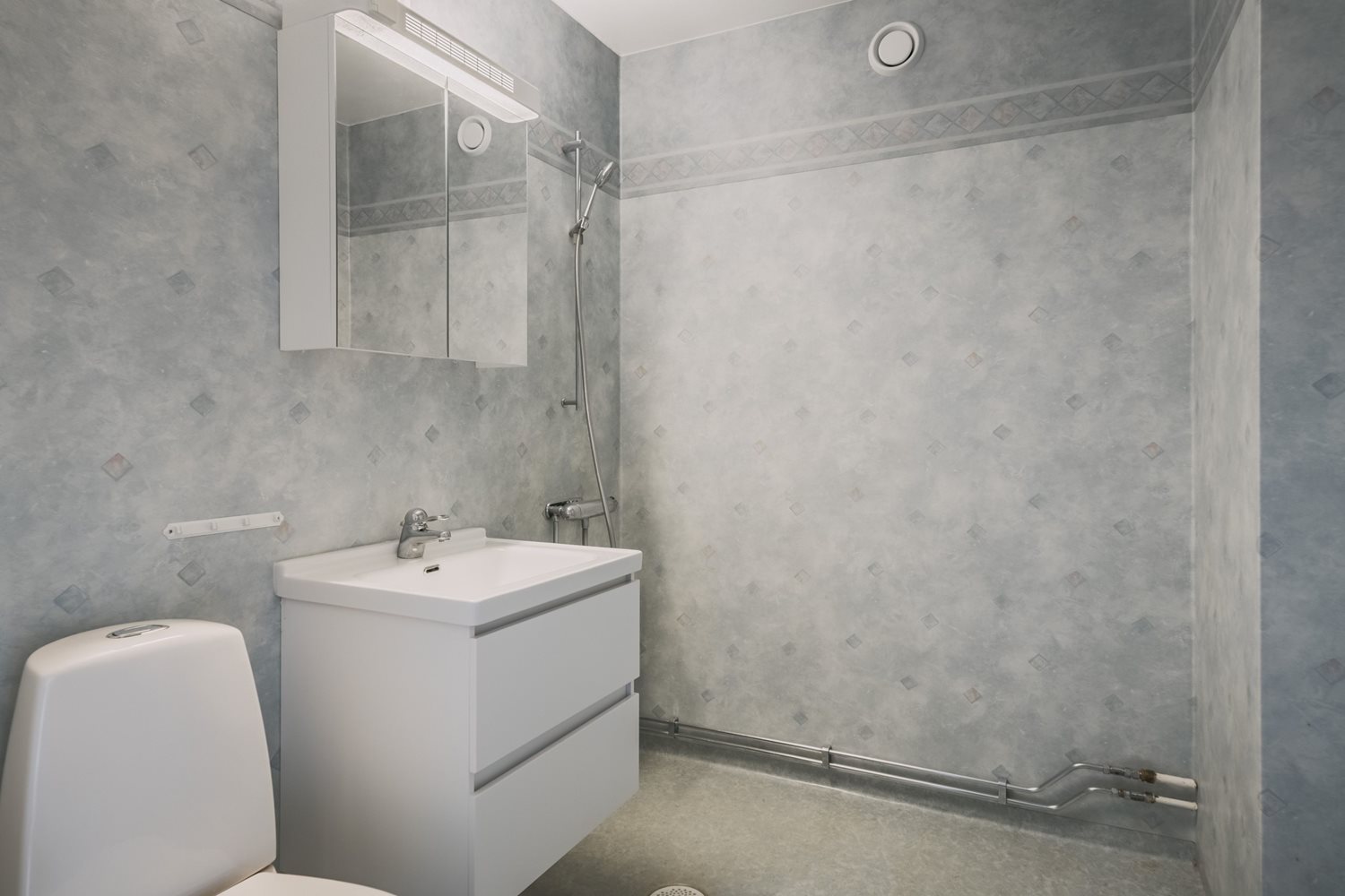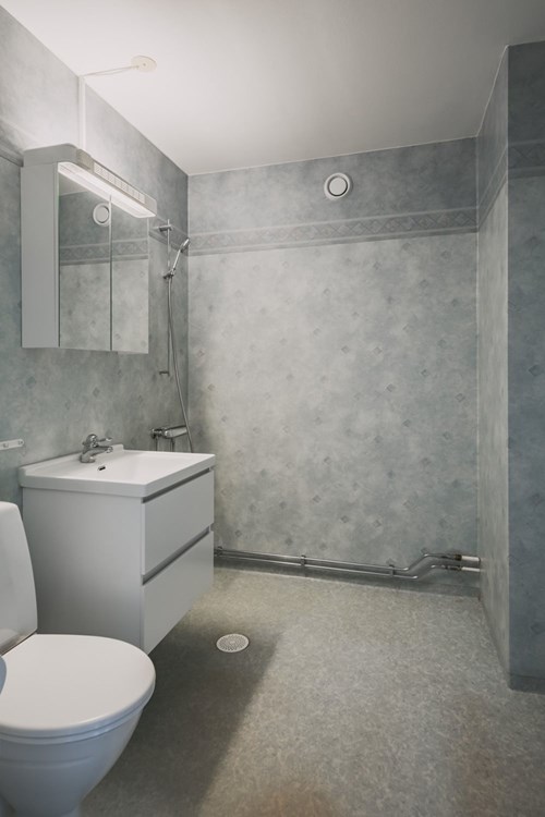 Löpande renovering av badrum med prio 1 vattenskada pga gjutjärnsbrunn.