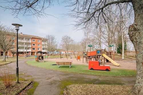 Fina uteplatser och grillplatser. Lekplatser, boulebanor och fotbollsplan med stora mål. 3 områden med kolonilotter.