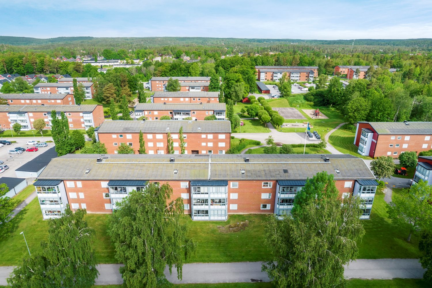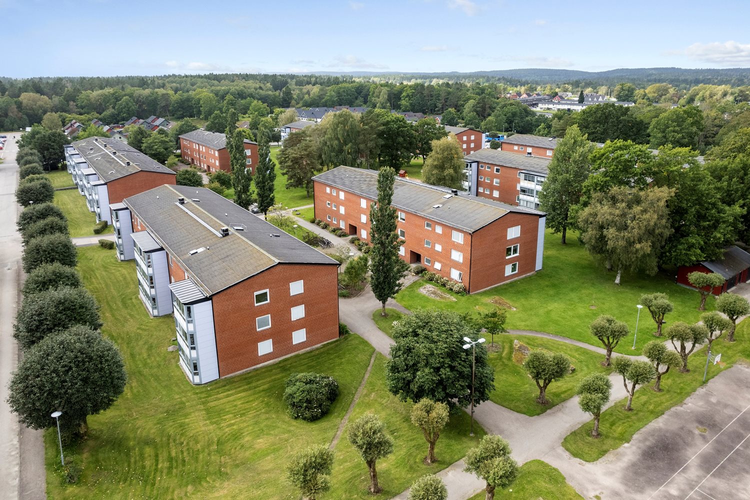 Fina och gröna innergårdar med lekplats, sittgrupper och tennisbana. Sopstationer med källsortering, restavfall samt matavfall.