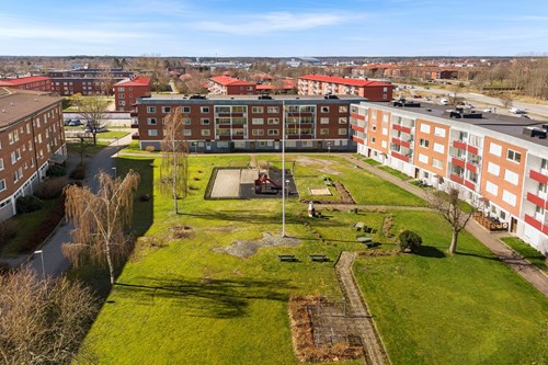 Innergård med lekplats, boulebana och berså med grill.