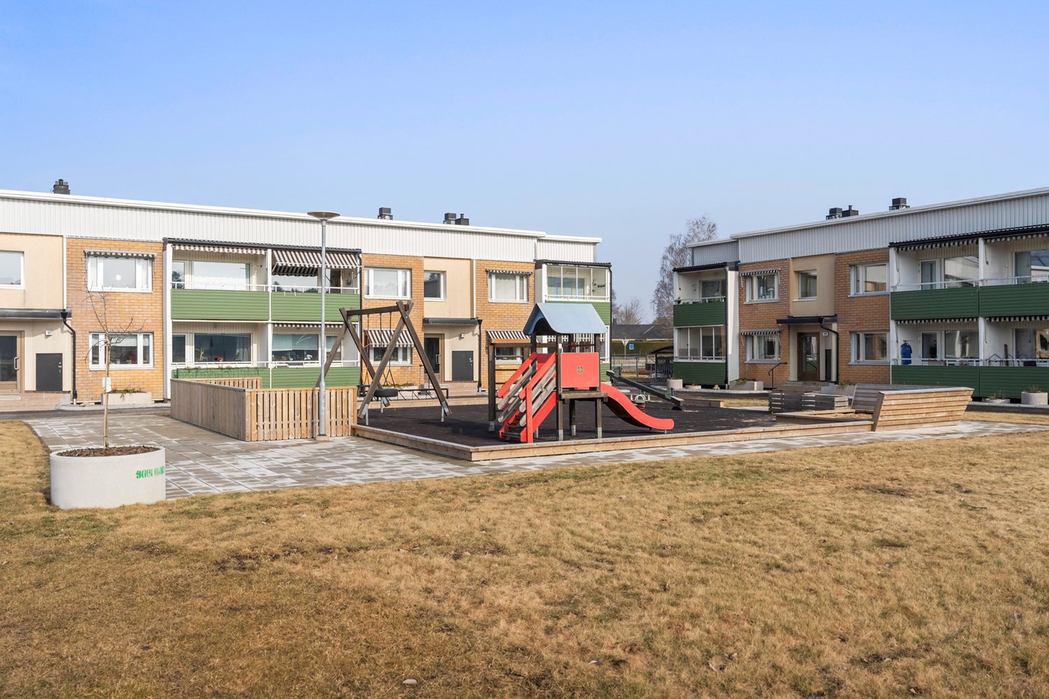 Fina och välskötta innergårdar med lekplats, grillplats, boulebana och sittplatser.