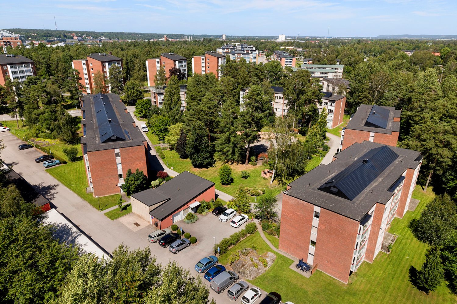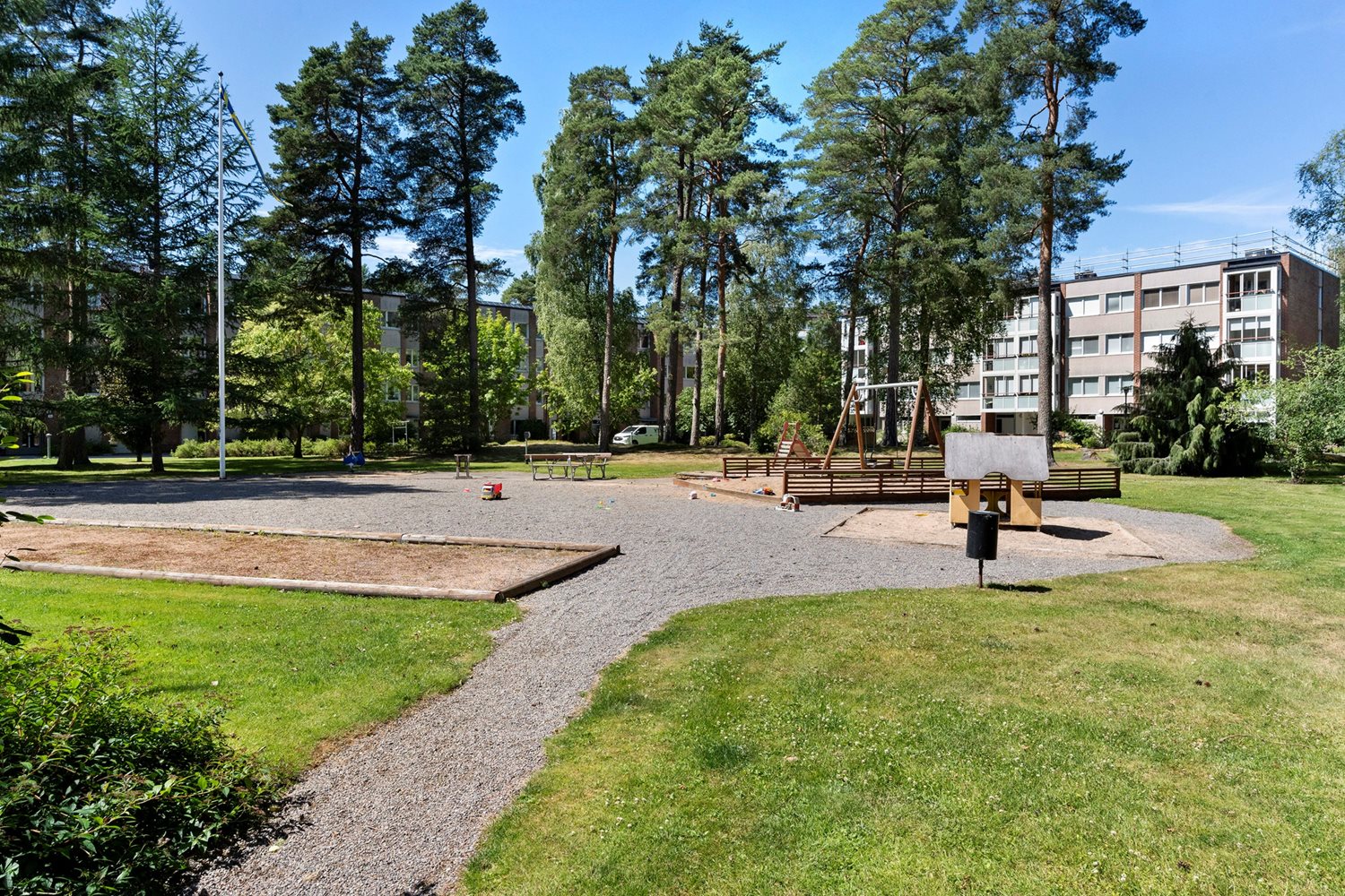 Mysig och grönskande innergård i skyddat läge med grill, sittplatser, grönytor och lekplats.