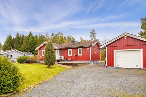 Garage med förrådsdel samt redskapsbod.