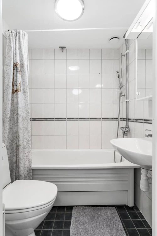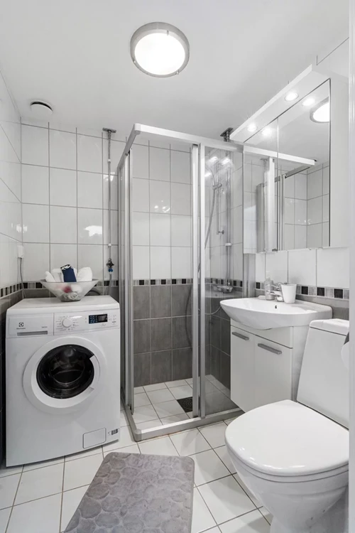 Fräscht badrum med kakel och klinkers. Wc, handfat, spegelskåp, dusch, badkar samt tvättmaskin.