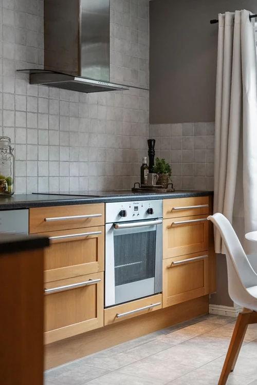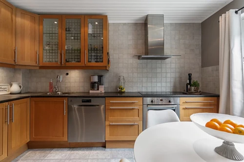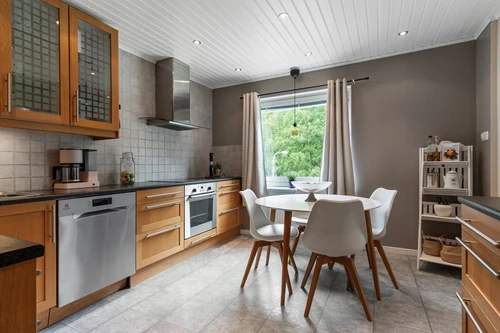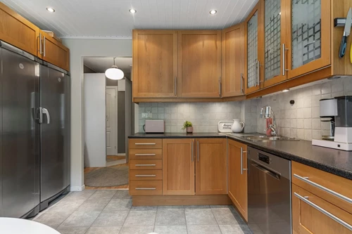 Stilrent kök med gott om förvaringsmöjligheter. Kyl och frys (-25), diskmaskin (-24), inbyggd ugn, induktions häll (-25) samt fläkt (-24).