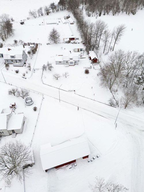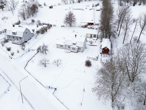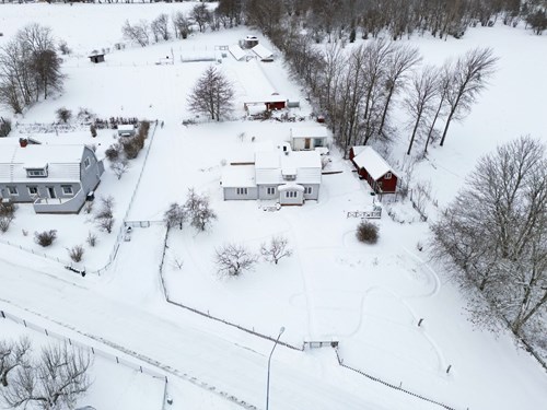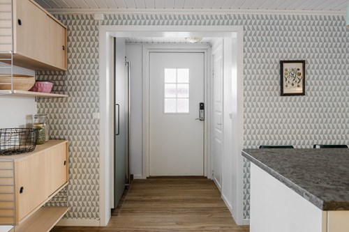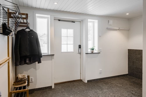 Stor och rymlig groventré med generösa avhängningsmöjligheter. Golvet pryds av vacker Kinnekullekalksten med behaglig golvvärme. Direkt innanför dörren finns en praktisk dusch, idealisk för att spola av smutsiga lekande barn eller hunden efter utevistelse. Från groventrén nås även ett badrum. Groventrén är belägen i en utbyggd del av huset som uppfördes 2018 och erbjuder en genomtänkt och funktionell entré för vardagens alla behov.