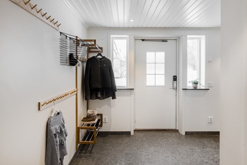Välkomnande finentré som leder vidare in i husets sociala delar. Här möts man av ljus och rymd med en naturlig koppling till både kök och vardagsrum.