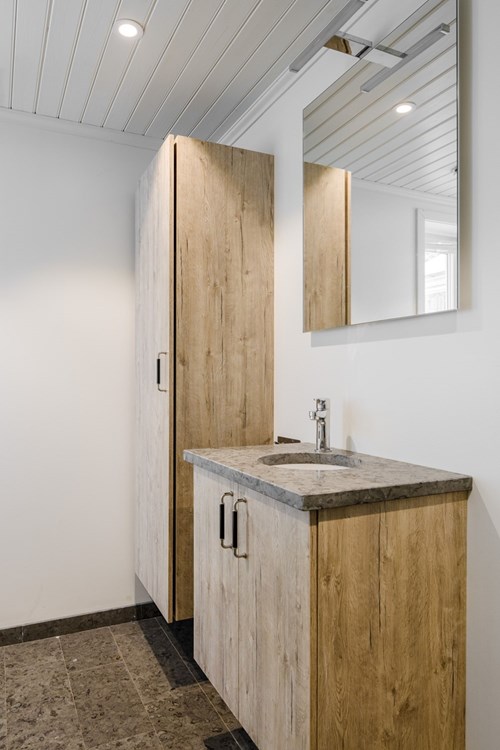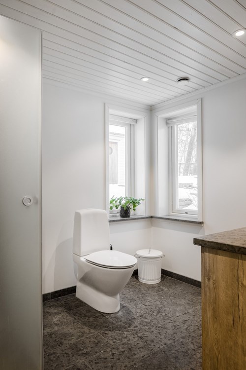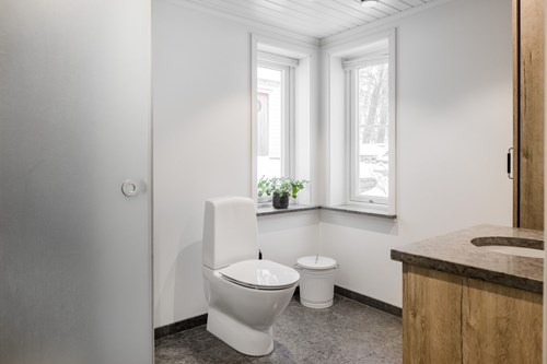 Ljust och stilrent badrum som nås från hallen, beläget i den utbyggda delen av huset som färdigställdes 2018. Två fönster ger ett generöst ljusinsläpp och skapar en härlig och luftig känsla. Golvet är klätt i vacker Kinnekullekalksten med behaglig golvvärme. Badrummet är utrustat med WC, dusch med glasdörrar samt en elegant handfatskommod i matchande Kinnekullekalksten. Förvaring finns i badrumsskåp som bidrar till en praktisk och välordnad helhet.