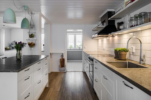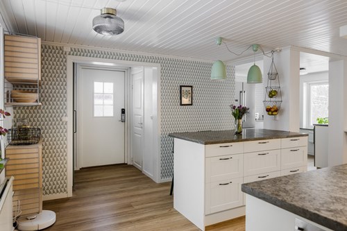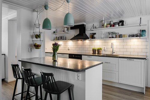 Modernt och stilrent kök från Epoq, nyrenoverat 2015, som nås både från groventrén och från husets finentré – vilket skapar ett smidigt flöde i vardagen. För extra bekvämlighet finns även en egen köksentré, praktiskt placerad med direkt kontakt mot attefallshuset och hönshuset. Köket har en trevlig köksö som fungerar både som arbetsyta och samlingsplats. Fina bänkskivor i Kinnekullekalksten, gott om förvaring och generösa arbetsytor gör köket både praktiskt och estetiskt tilltalande. Här finns ett rymligt skafferi man kan gå in i, en extra frys samt all modern utrustning man kan behöva för matlagning och bakning.