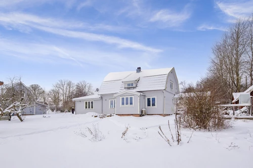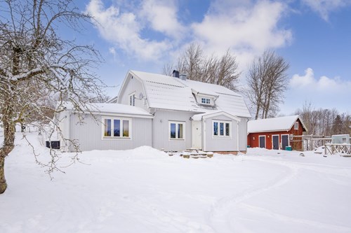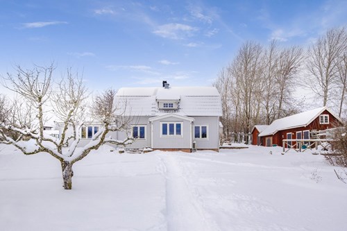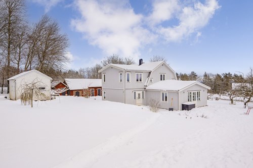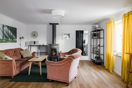 Mycket stort och inbjudande vardagsrum som byggts ut för att skapa generösa sällskapsytor. I den äldre delen finns en mysig eldstad som bidrar till värme och stämning. Den nyare delen har ryggåstak och stora fönsterpartier som släpper in rikligt med ljus och bjuder på vacker utsikt över de natursköna omgivningarna. Här finns även utgång till trädgården.