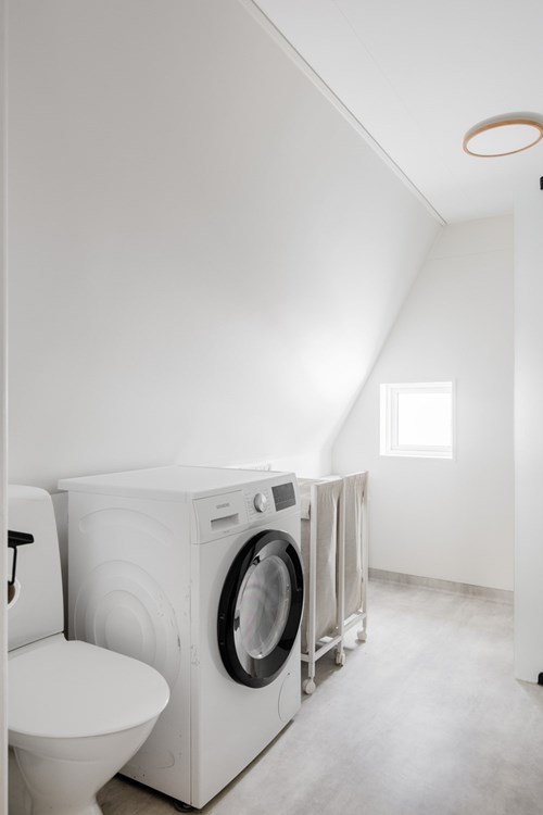 Nyrenoverat och stilrent badrum med moderna och genomtänkta materialval. Ljusa våtrumstapeter i kombination med våtrumsmatta i moderna färgtoner skapar en fräsch och harmonisk helhet. Här finns tvättmaskin som underlättar vardagen samt ett litet fönster som ger ett fint och naturligt ljusinsläpp. Ett praktiskt och tilltalande badrum för hela familjen.