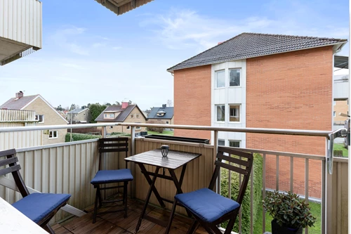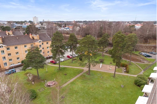 Trevlig innergård med grillplats, lekplats, gräsytor och sittplatser.