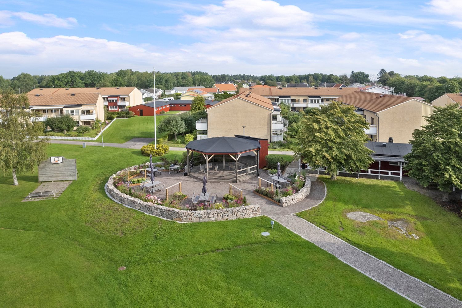 Föreningen har ett stort grönområde centralt placerat, med husen som en skyddande ring runtom. På gården finns två lekplatser, grillplats, dansbana, asfalterad plan, fotbollsmål samt basketring. I föreningen finns även kolonilotter för odling (sep. kö).