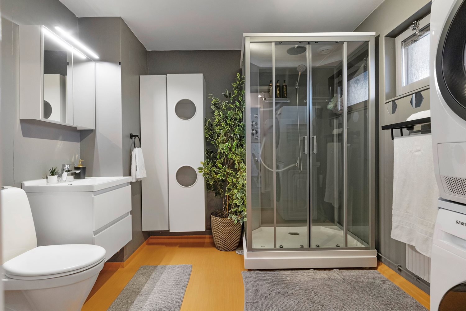 Till varje lägenhet hör en garageplats med eluttag för elektrisk motorvärmare (ej elbil). Det finns även parkeringsplatser för boende och besökare samt 8 st laddplatser.