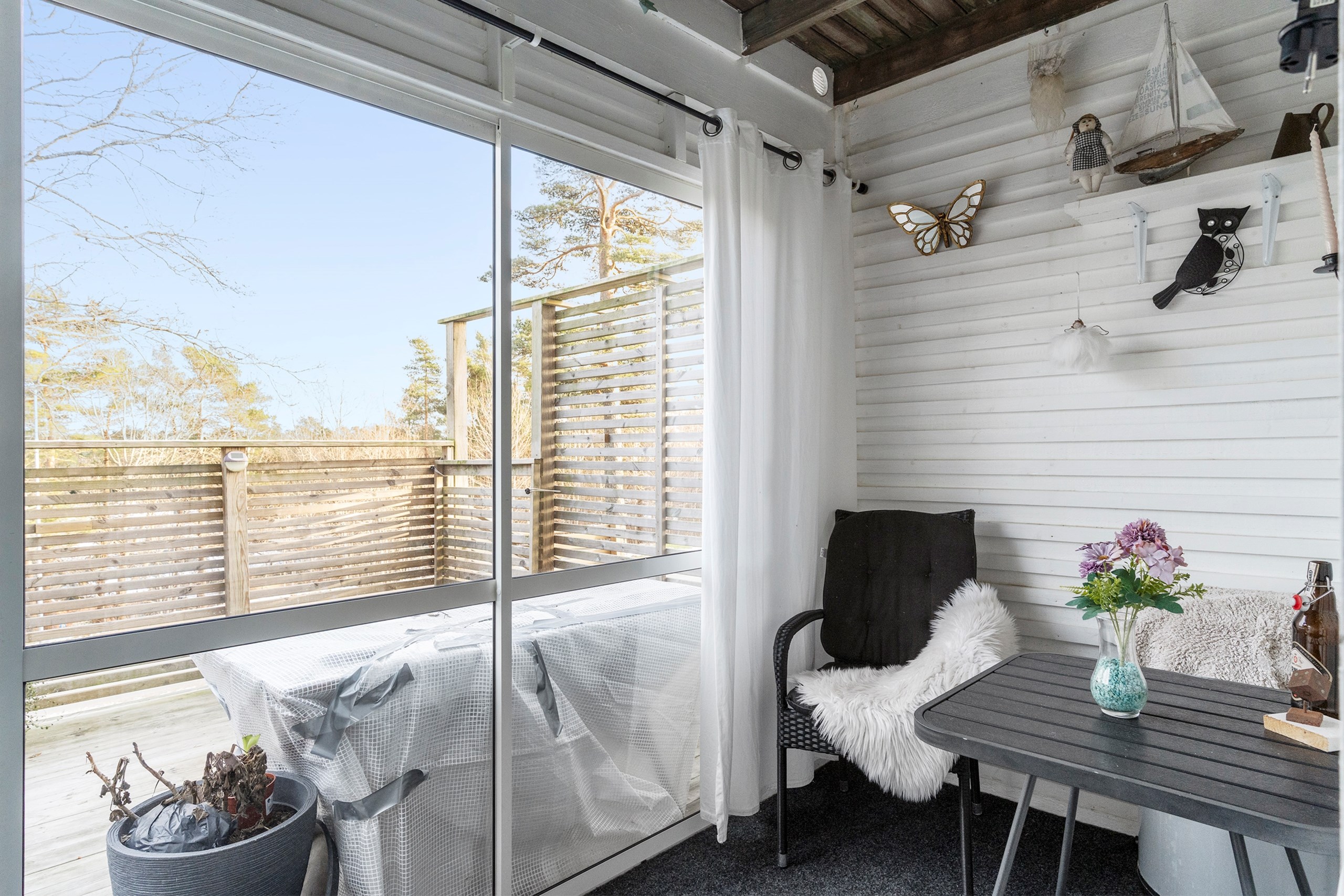 Sovrum med plastmatta och målade väggar samt utgång till det inglasade uterummet och den härliga altanen på baksidan i österläge.