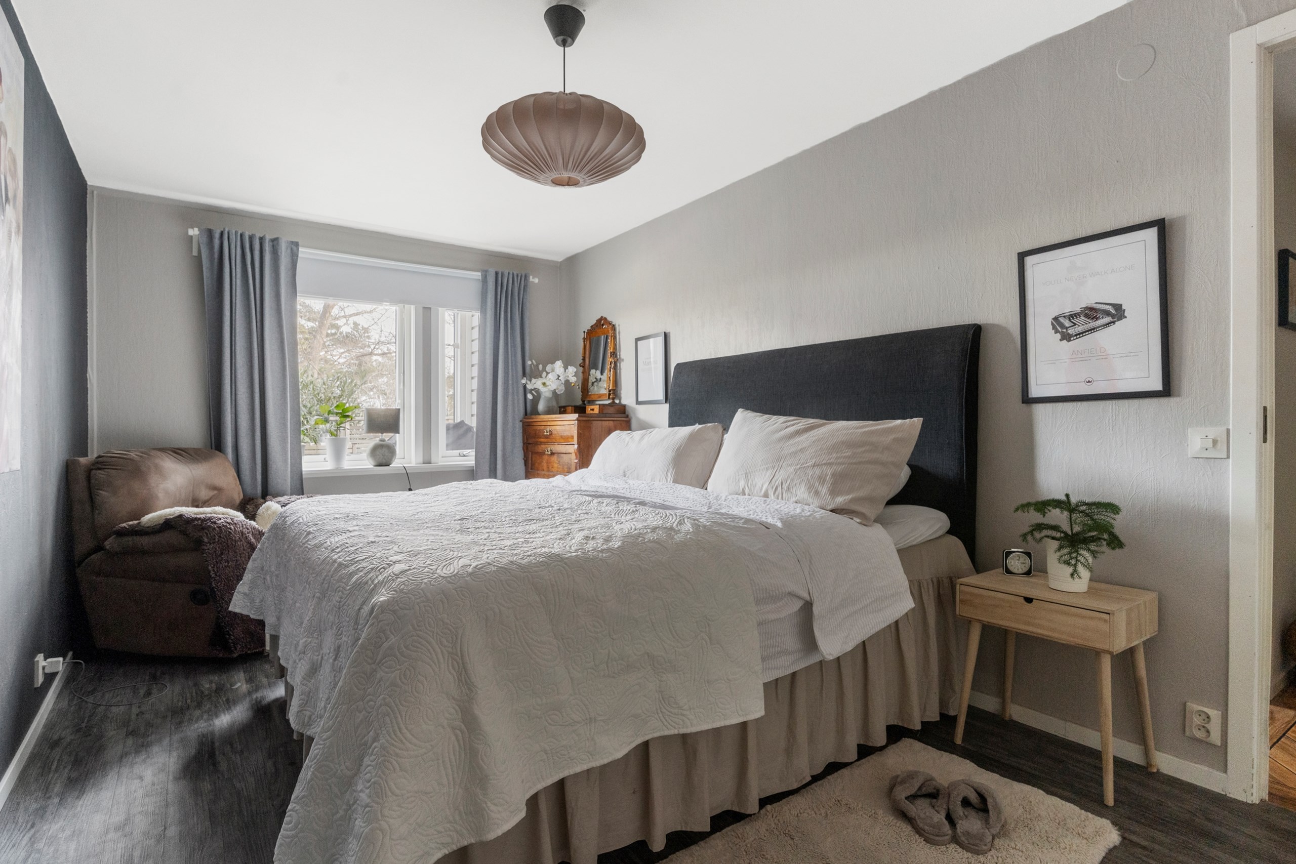 Rymligt sovrum med plastmatta och målade väggar. Här finns gott om utrymme för extra förvaringsmöbler.
