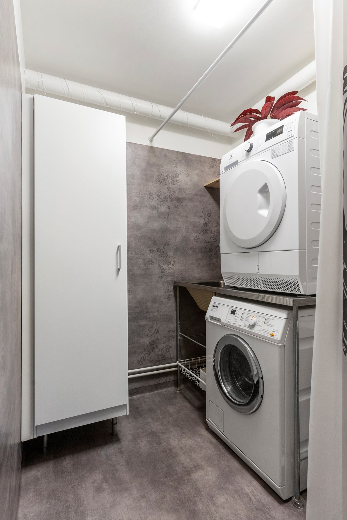 Nyrenoverad tvättstuga från 2023 med våtrumsmatta. Tvättho, tvättmaskin, torktumlare (-24) samt en garderob.