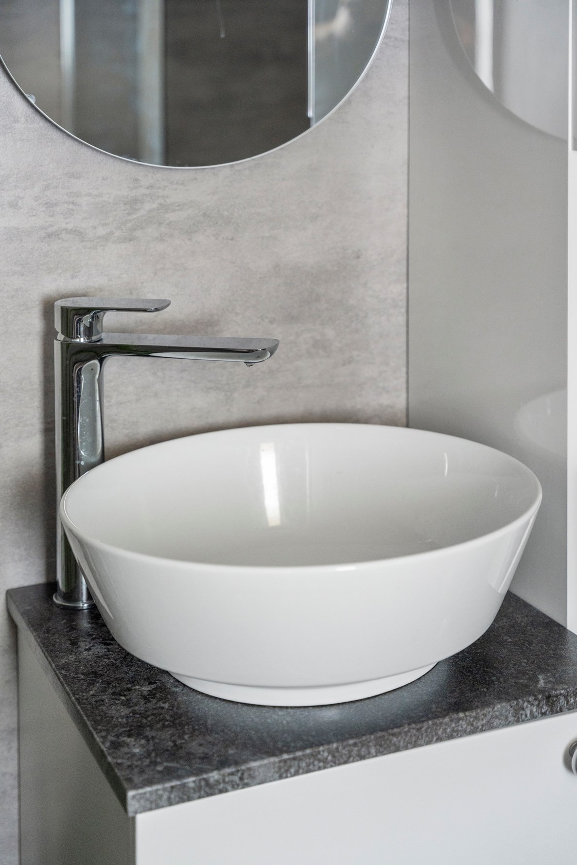Fräscht badrum som renoverades 2025 med våtrumsmatta på golv och väggar. Wc, handfat, spegel, badrumsskåp och duschvägg.
