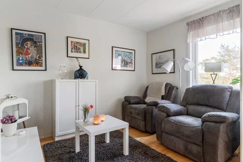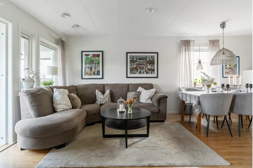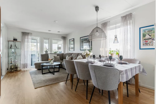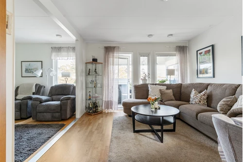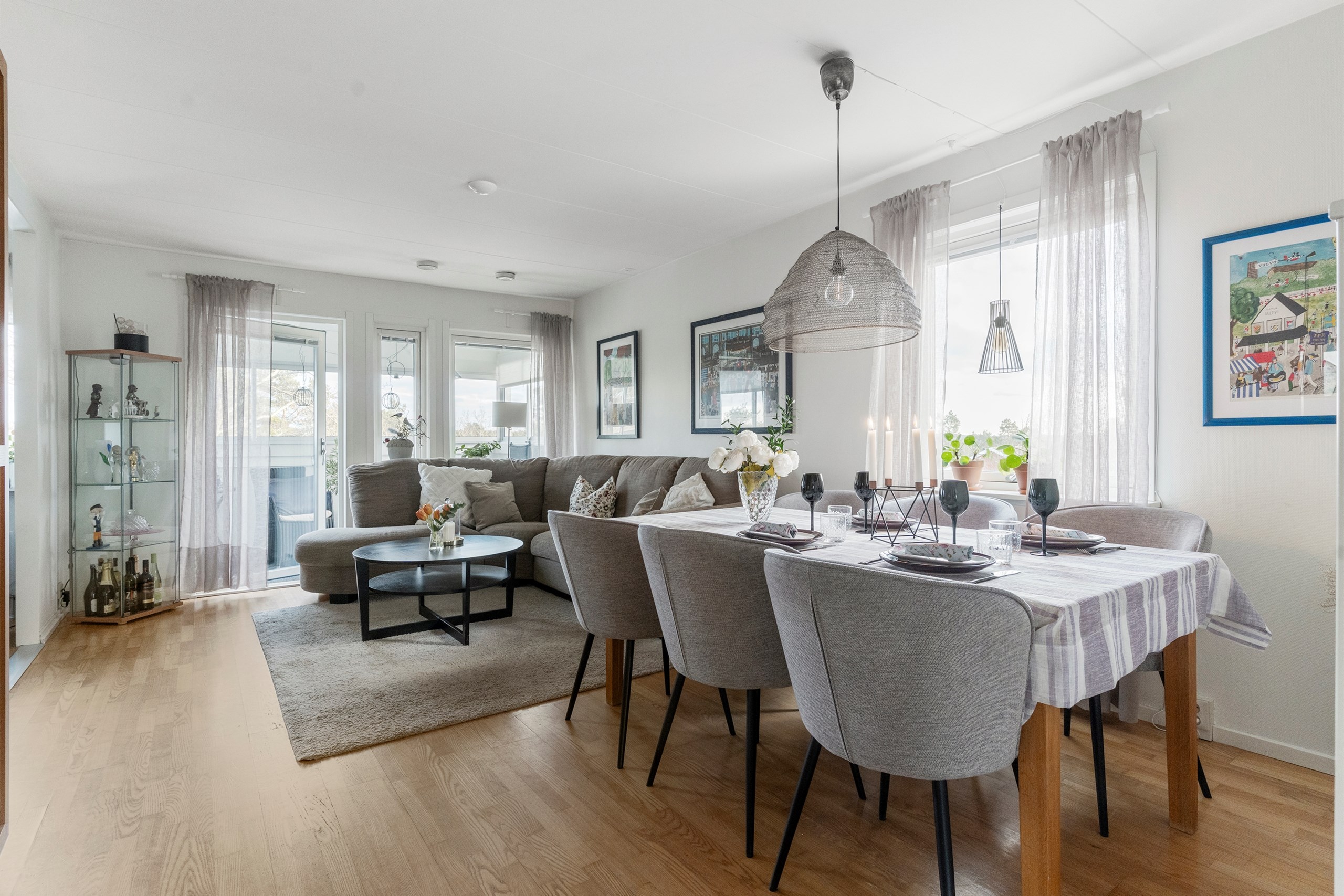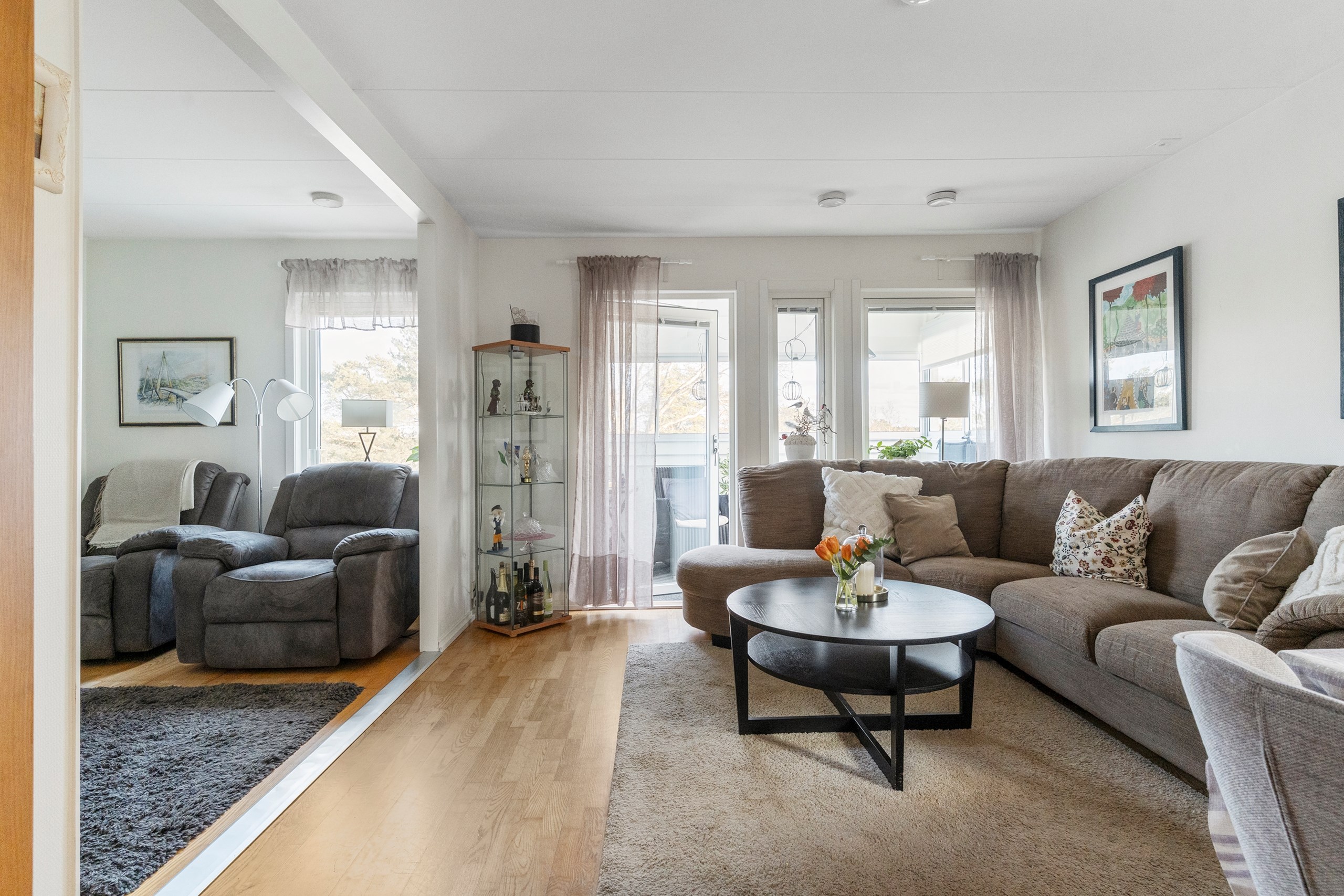 Ljust och rymligt vardagsrum med fönster åt två väderstreck tack vare gavelläget. Parkettgolv och målade väggar samt utgång till den inglasade balkongen.