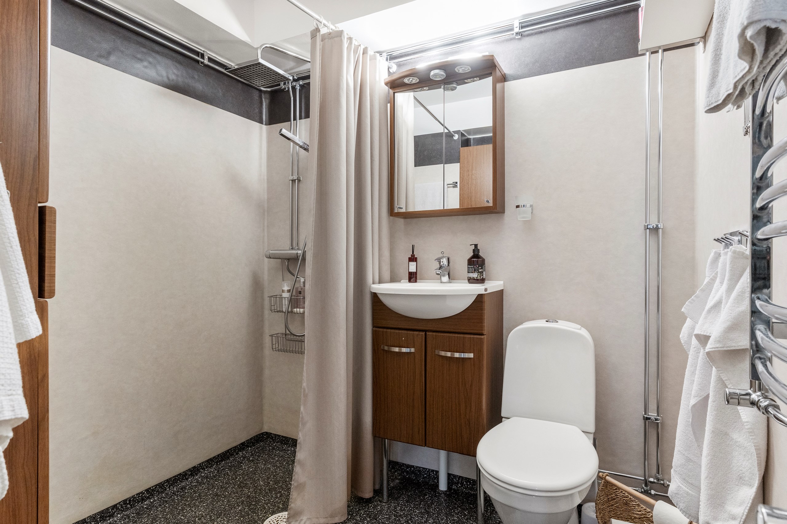Fräscht badrum som renoverades 2018 med våtrumsmatta på golv och väggar. Wc, handfat, dusch och badrumsskåp. Här finns även plats för den som vill ha badkar istället för dusch.