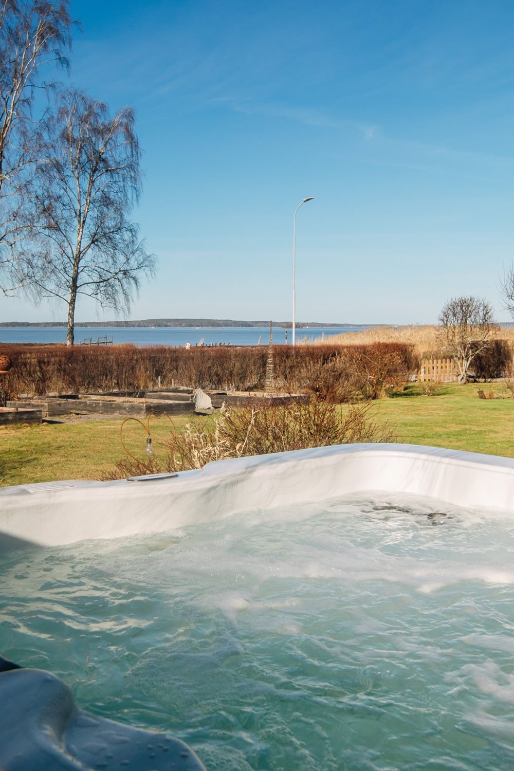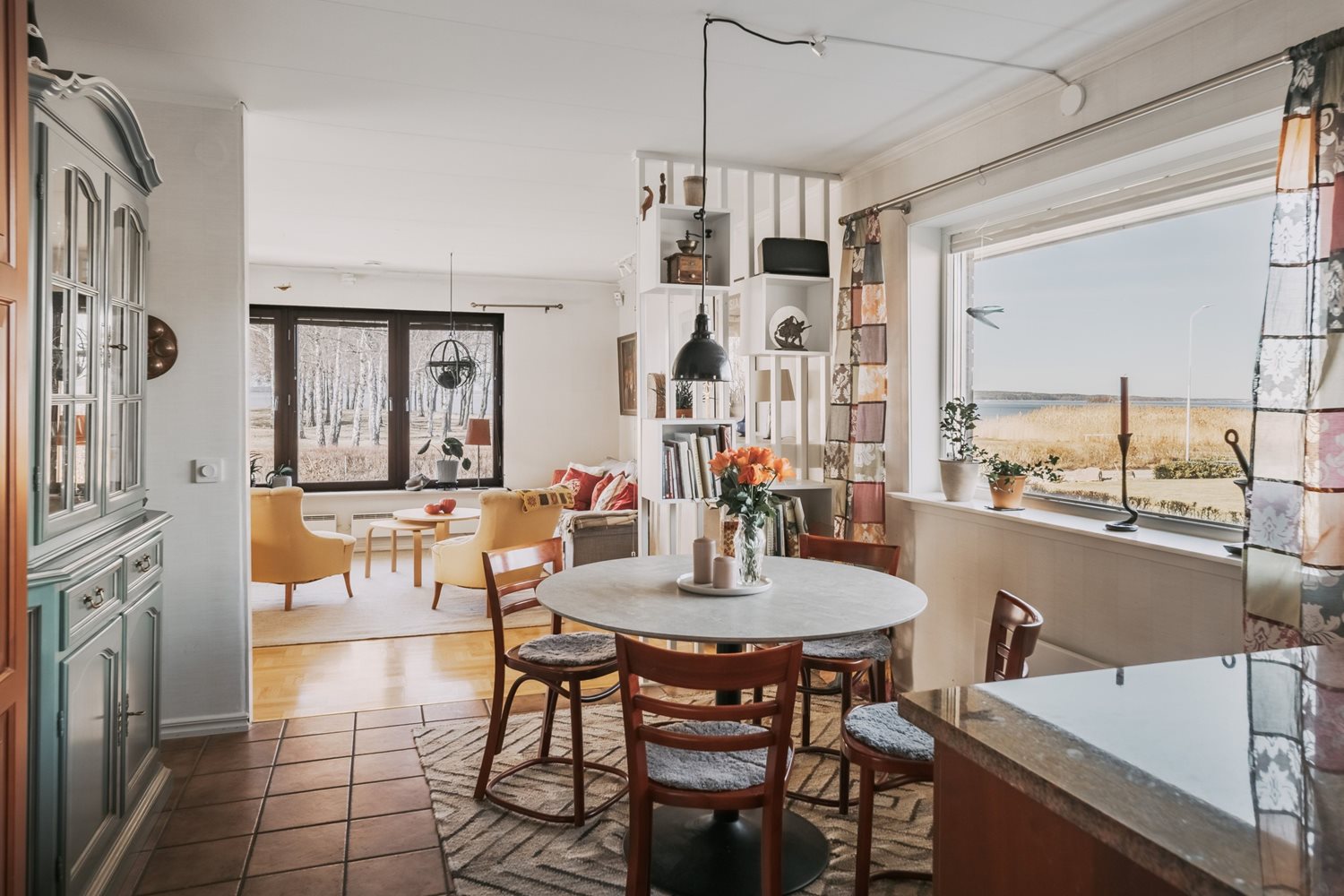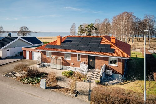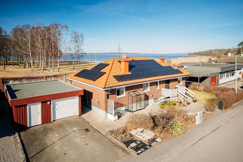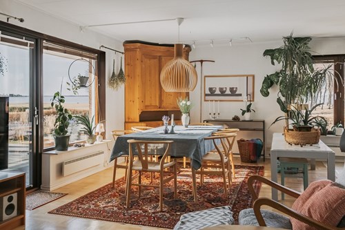 Ett fantastiskt vardagsrum som sträcker sig längs hela sjösidan och bjuder på en magisk utsikt över Vänern. De generösa ytorna ger gott om plats för både en inbjudande soffgrupp, ett rymligt matbord och en naturlig tv-hörna – perfekt för såväl avkoppling som umgänge.