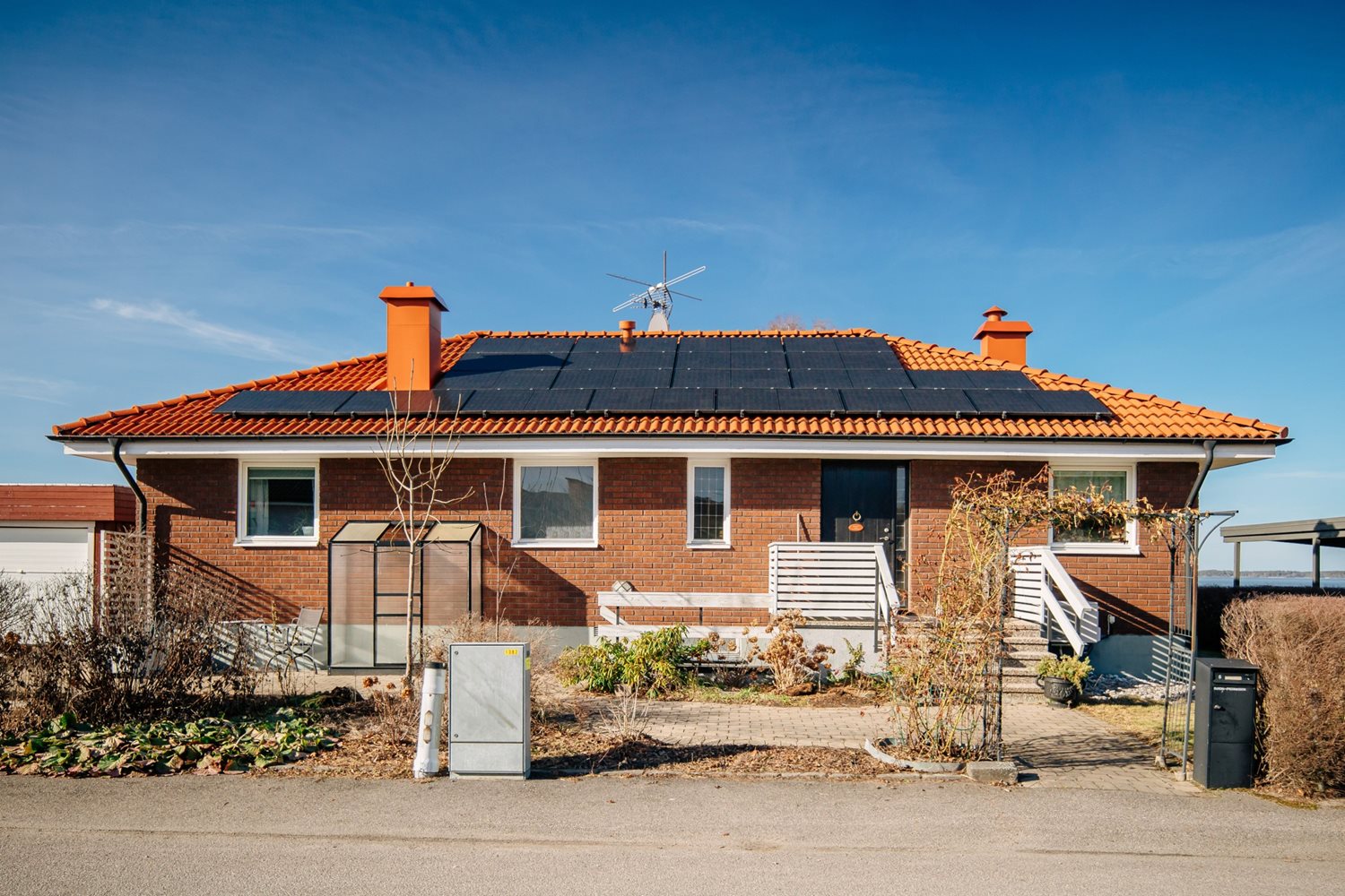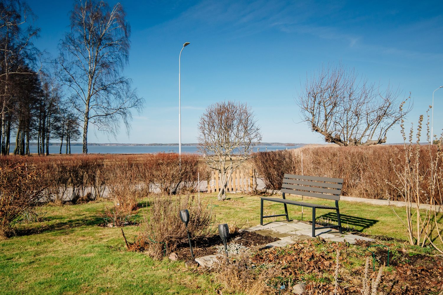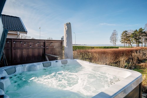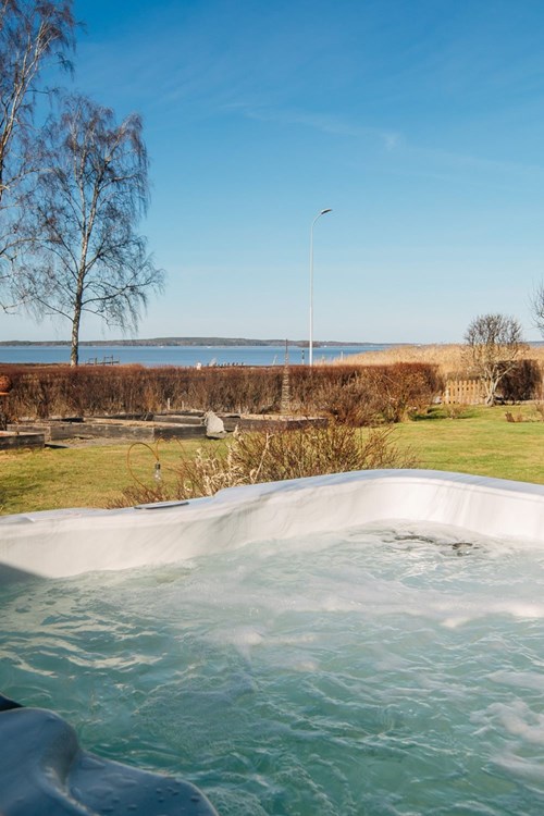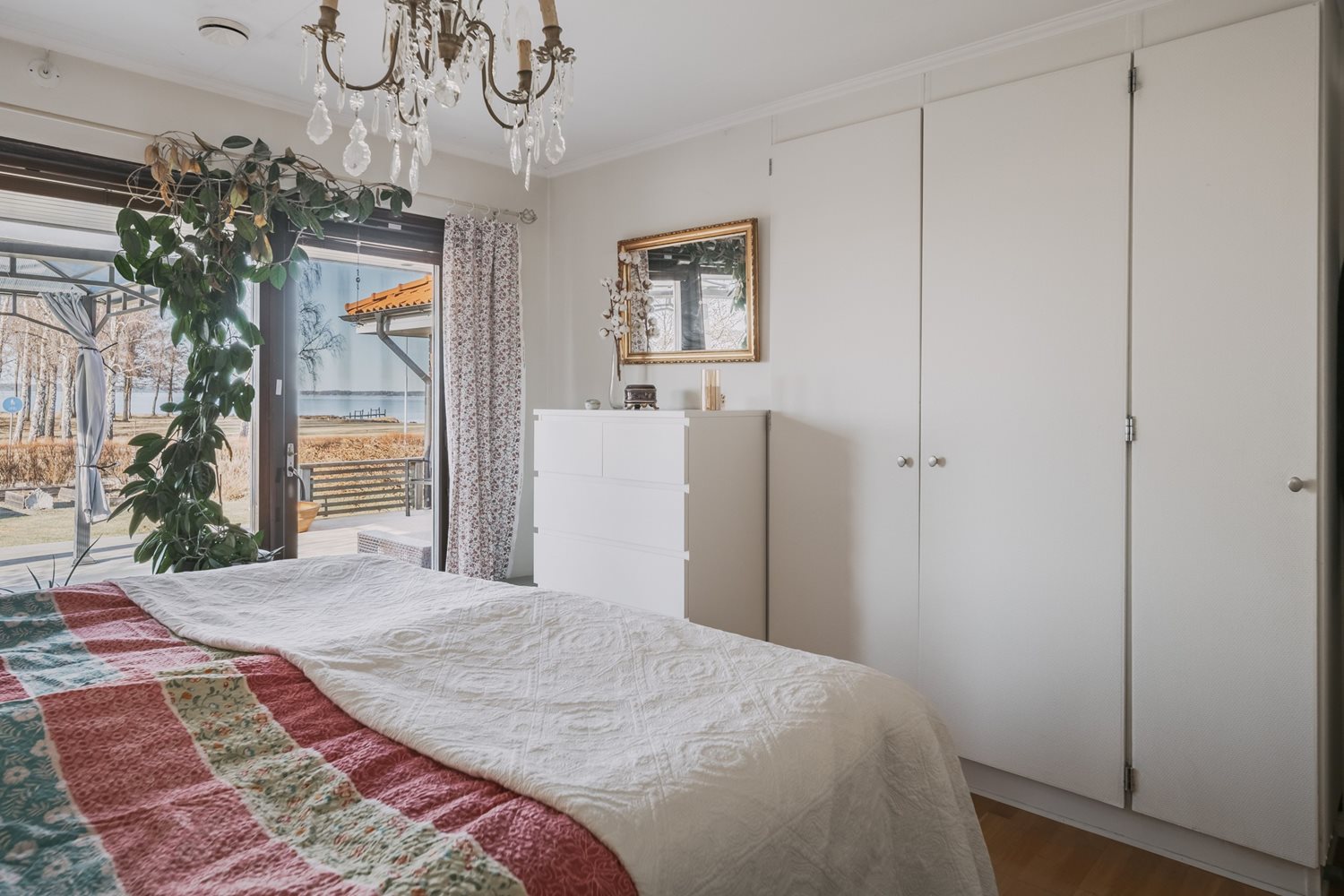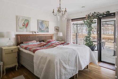 Master bedroom är ett riktigt drömrum med generösa ytor och plats för en stor dubbelsäng. Härifrån öppnar sig dörren direkt ut till altanen mot Vänern, vilket skapar en privat oas där morgonkaffet eller kvällens lugna stunder får den perfekta utsikten som bakgrund.