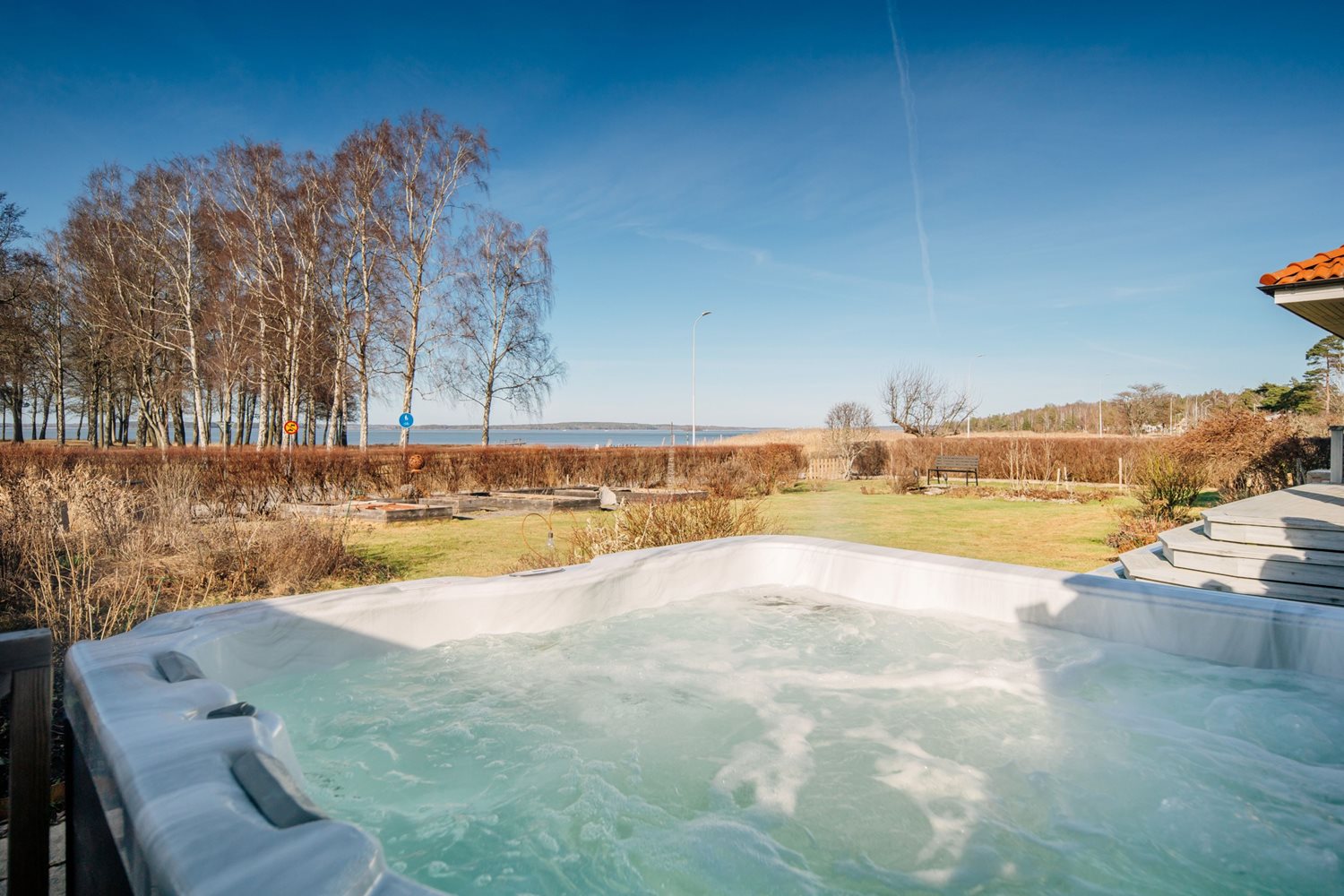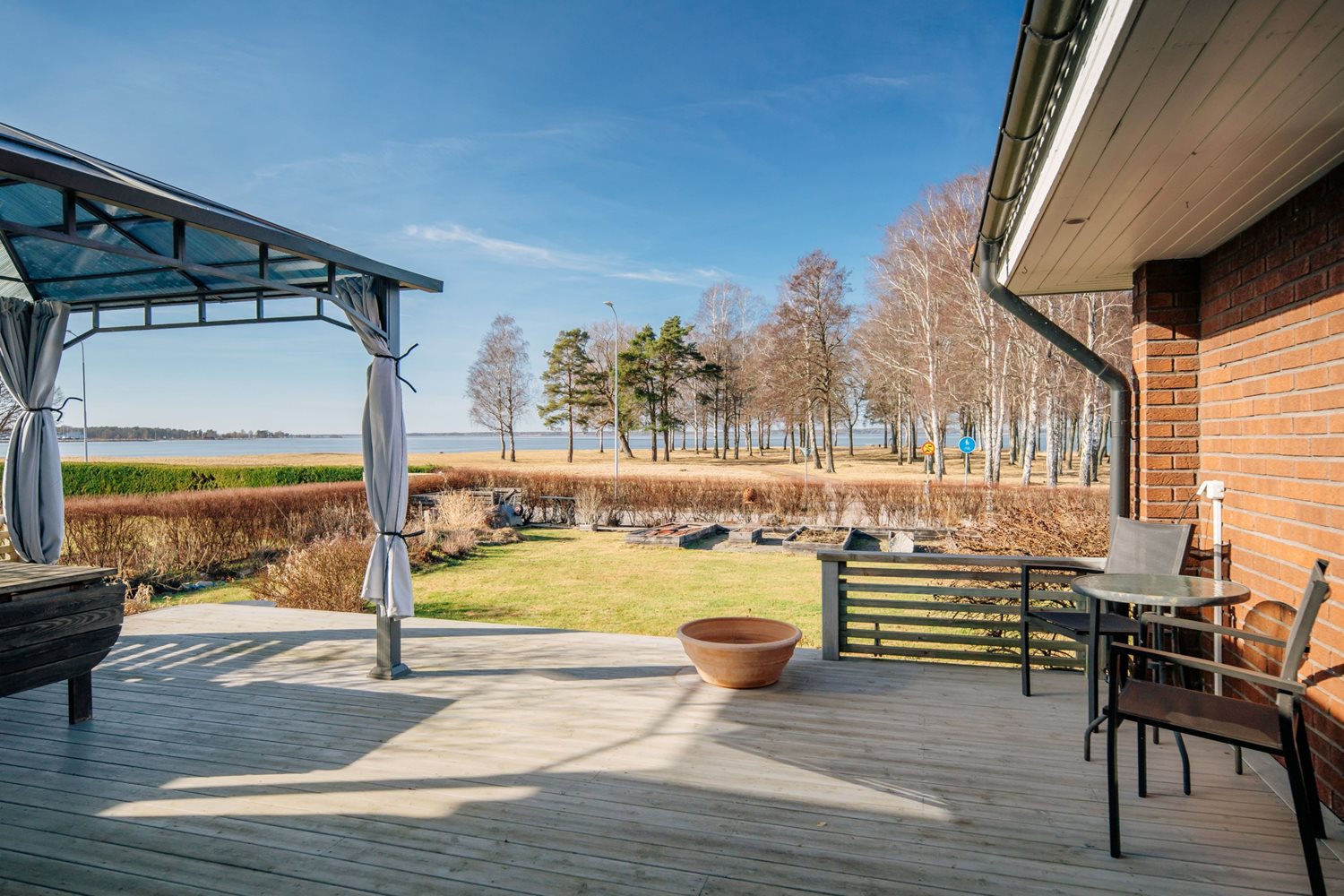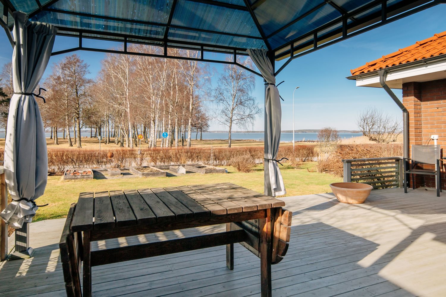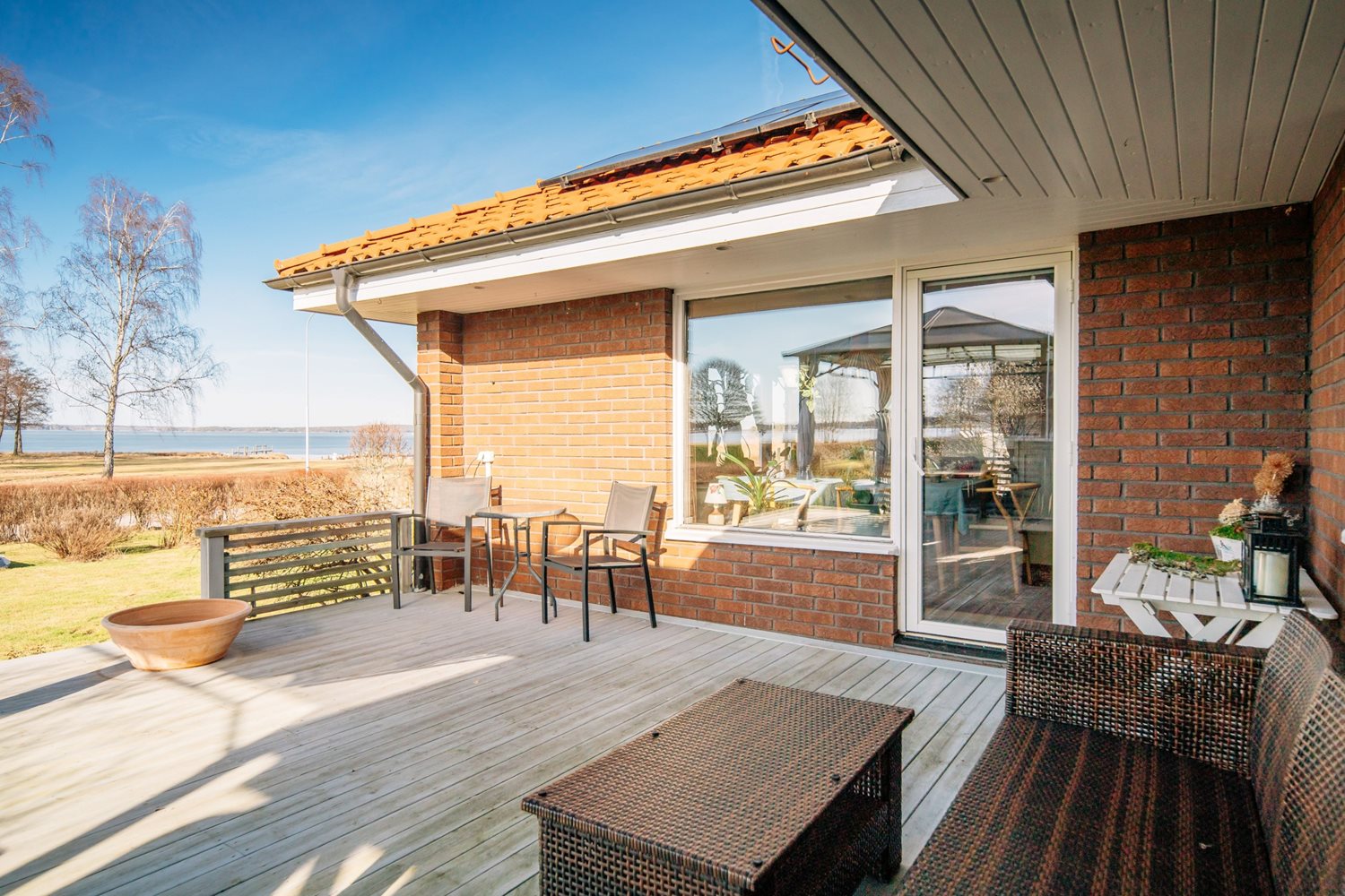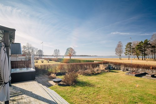 De stora fönsterpartierna suddar ut gränsen mellan ute och inne och låter ljuset flöda fritt genom rummet. Härifrån når du även altanen med trädäck, en självklar plats för sommarens måltider och stilla kvällar med sjön som kuliss.