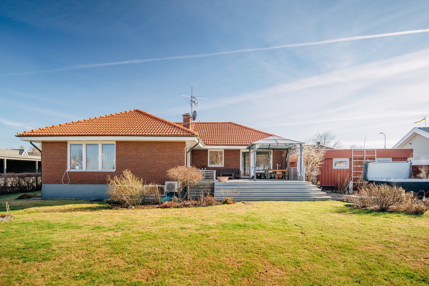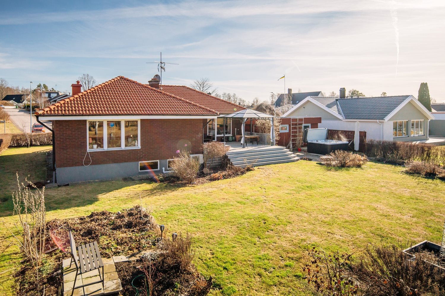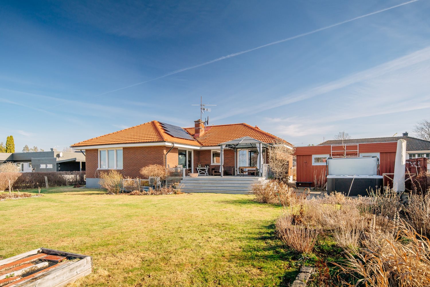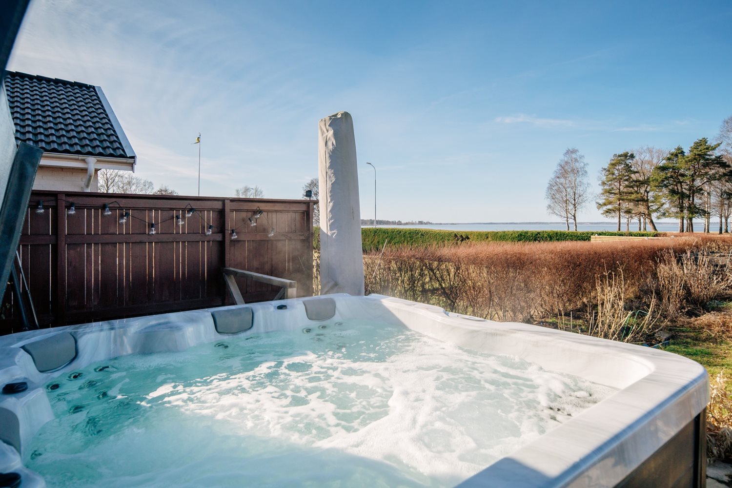 De stora fönsterpartierna suddar ut gränsen mellan ute och inne och låter ljuset flöda fritt genom rummet. Härifrån når du även altanen med trädäck, en självklar plats för sommarens måltider och stilla kvällar med sjön som kuliss.