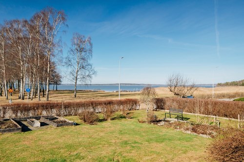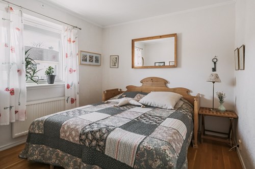 I den här delen av huset ligger det första av tre sovrum. Ett trivsamt och rogivande rum med fönster mot Vänern, där ljuset och den vackra utsikten skapar en behaglig atmosfär året om.
