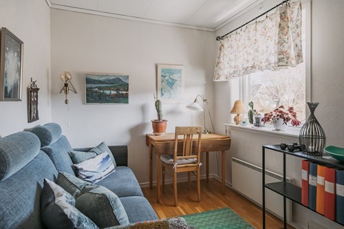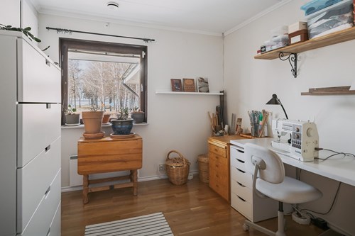 Redan i anslutning till hallen finns ett rum som passar utmärkt som hemmakontor, gästrum eller ett mindre sovrum. Det trevliga fönstret mot gatan ger fint ljusinsläpp och skapar en behaglig arbets- eller vilomiljö.