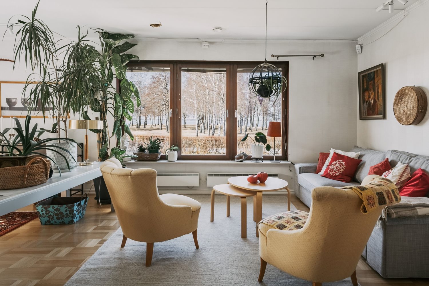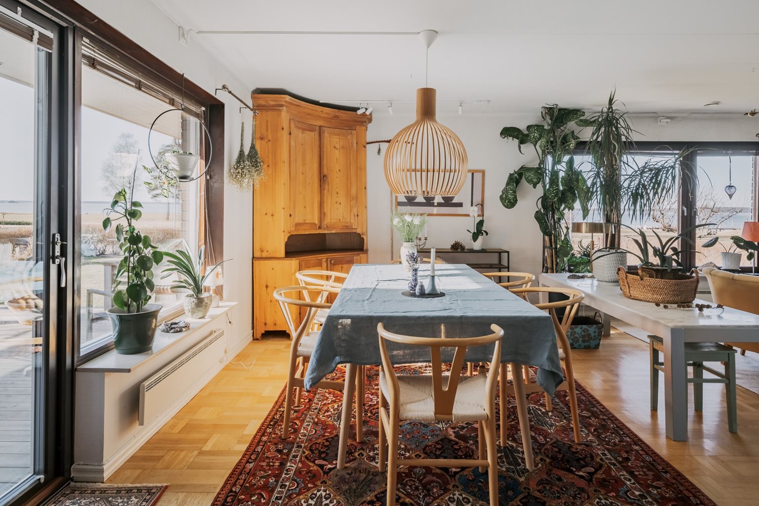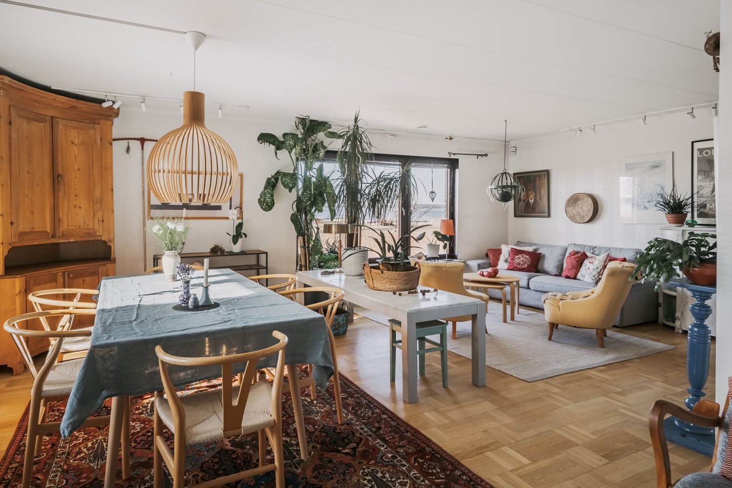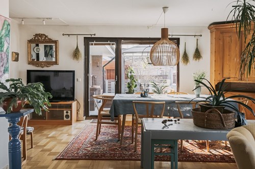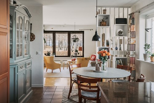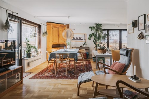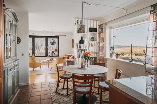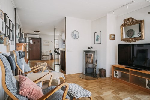 Vardagsrummet ligger i öppen anslutning till köket, vilket skapar en social och luftig planlösning där familj och gäster kan samlas och trivas tillsammans. I denna del av huset ligger en vacker stavparkett som verkligen kommer till sin rätt i det generösa ljusinsläppet.