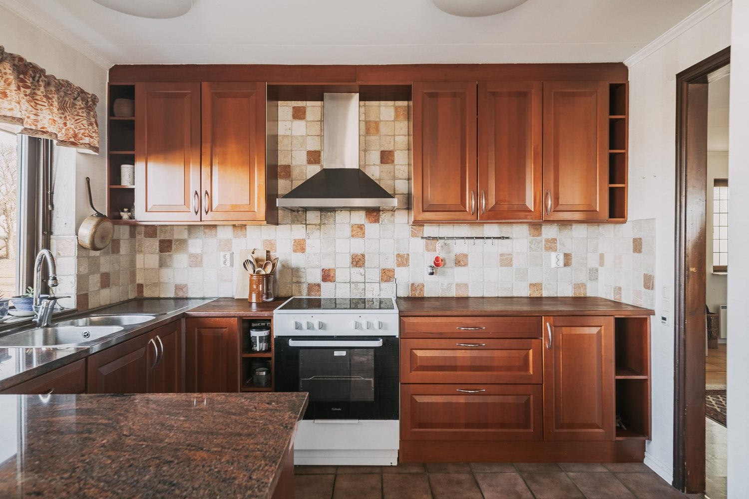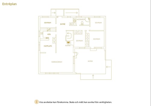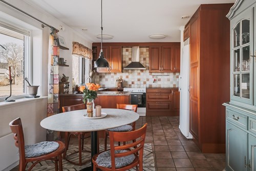 Köket är utrustat med spis, ugn, fläkt, kyl samt diskmaskin – allt bekvämt samlat för att förenkla vardagen i ett hem där både funktion och trivsel står i fokus. I köket ligger ett praktiskt klinkergolv som även fortsätter under matplatsen.