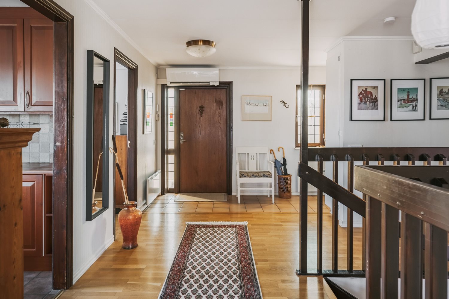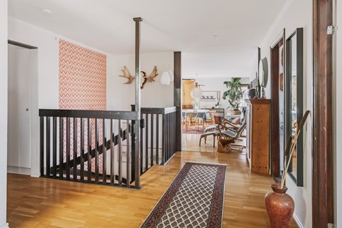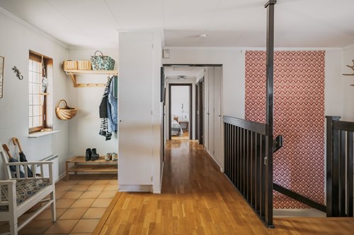 Hallen binder elegant samman markplanet och ger en härlig känsla av rymd och ljus. Den generösa planlösningen skapar ett naturligt flöde mellan hemmets ytor och gör det lika trivsamt att komma hem själv som att välkomna gäster. Här får du en entré som inte bara är välkomnande – utan som verkligen gör intryck. Entrédelen av hallen har ett praktiskt klinkergolv som sedan övergår i en vacker ekparkett som elegant breder ut sig över större delen av våningsplanet.