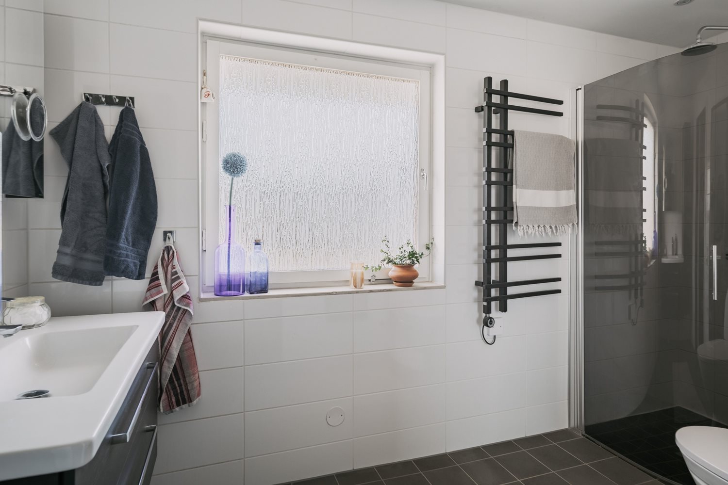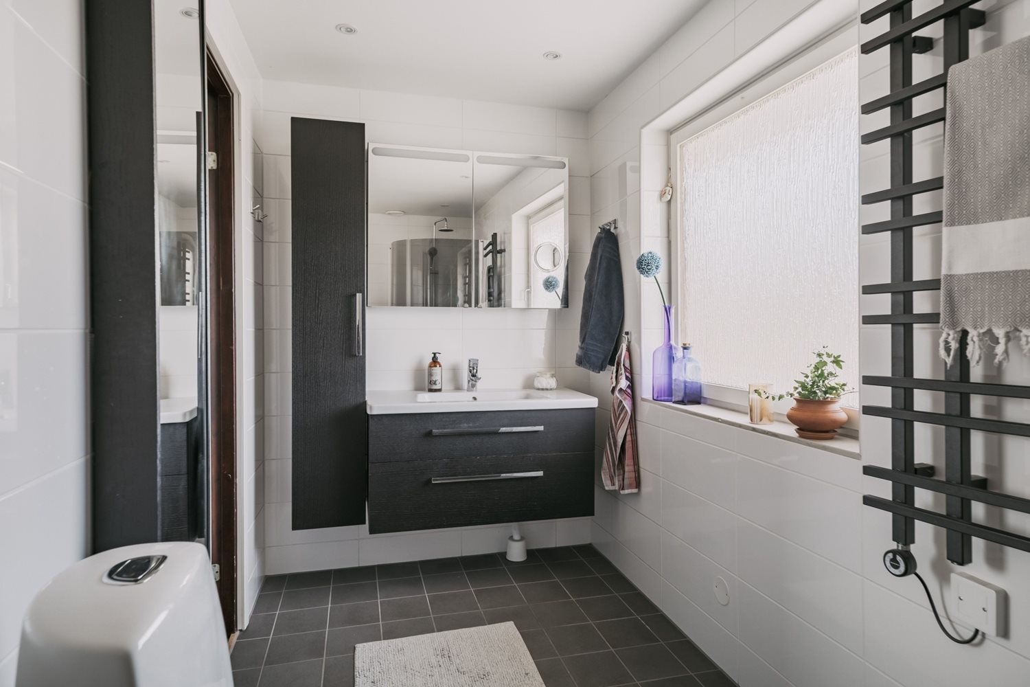 Fönstret släpper in naturligt ljus och skapar en ljus och trivsam atmosfär, vilket gör badrummet både praktiskt och inbjudande – en plats att börja och avsluta dagen på med stil.