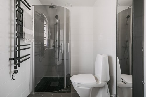 Badrummet är fräscht och stilrent med kakel och klinker, en perfekt kombination av funktion och elegans. Här finns en duschplats, tvättställskommod och wc-stol, allt omsorgsfullt placerat för maximal bekvämlighet.